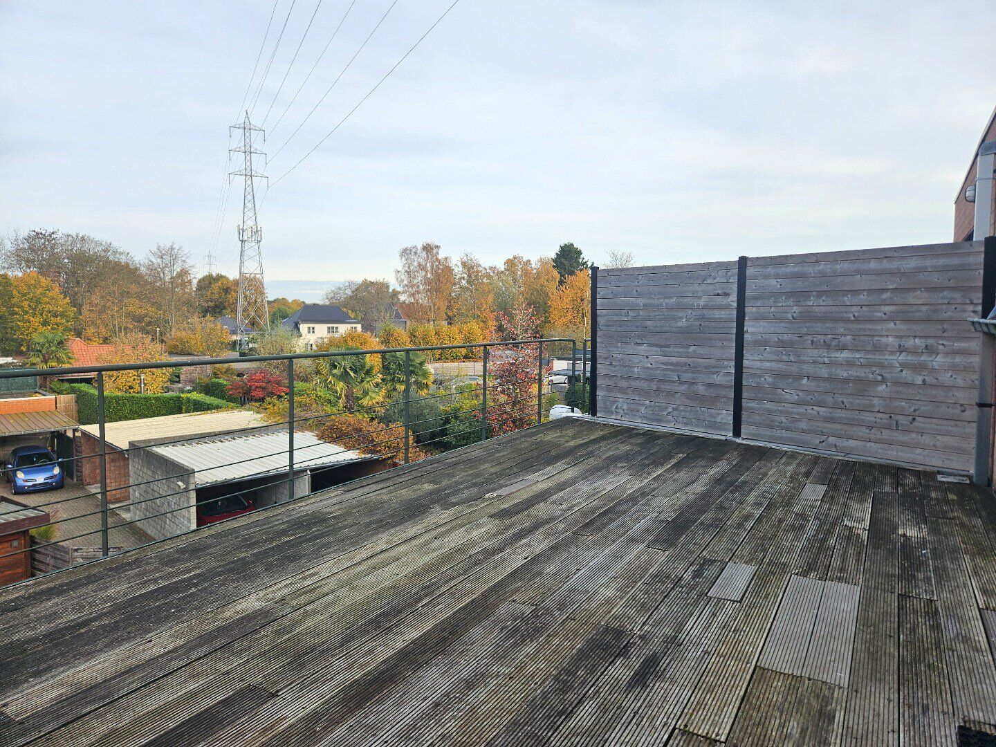 Het terras is toegankelijk via het grote raam in de keuken. Achteraan het gebouw is een carport aanwezig.