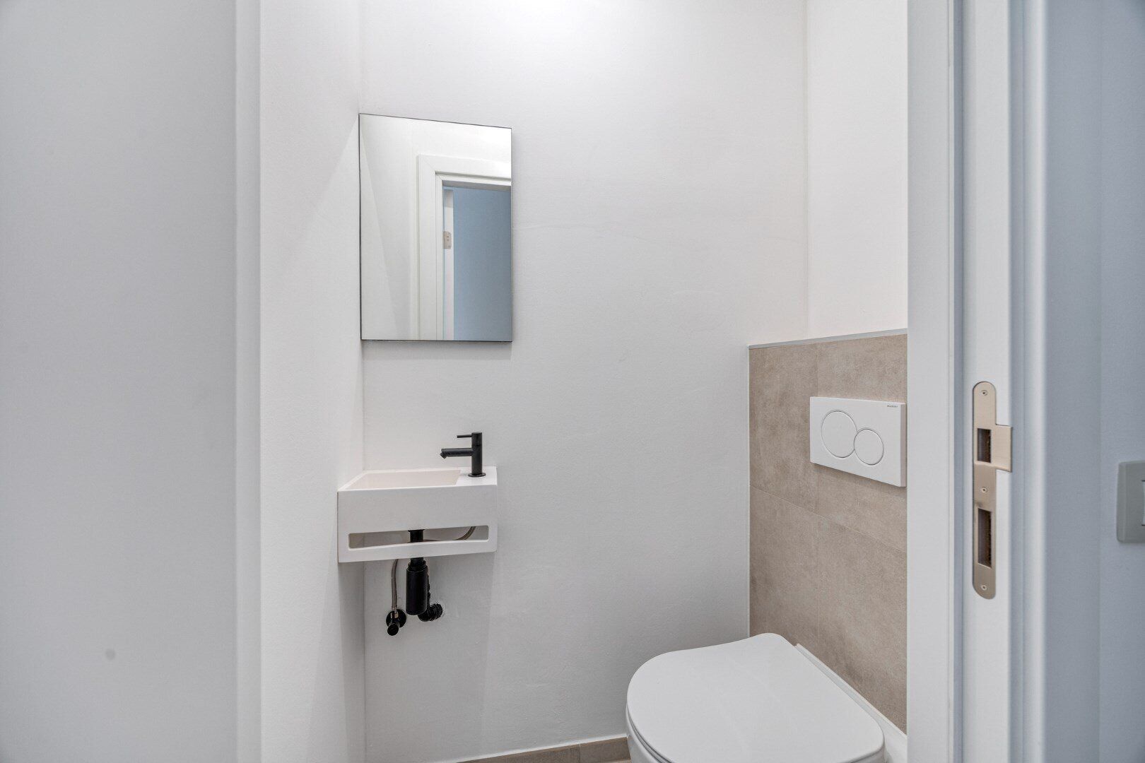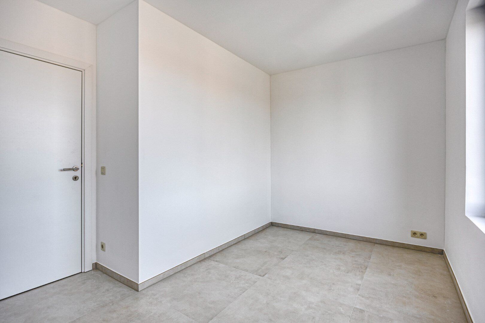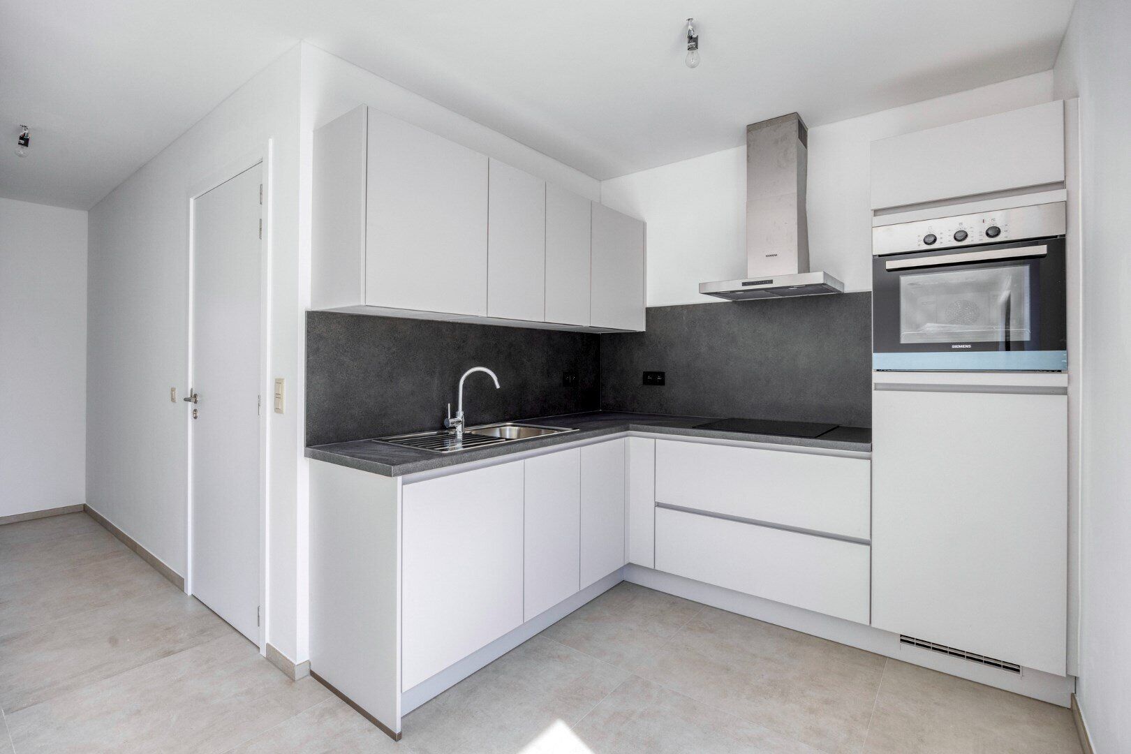 Via de inkomhal, met vestiaire, kom je terecht in de ruime woonkamer, opgedeeld in een eethoek, zithoek en open keuken. Dankzij het grote schuifraam geniet de woonkamer van zeer veel lichtinval, wat tevens bijdraagt tot een ruimtelijk gevoel. De keuken is uitgerust met een inductievuur, afzuigkap, oven, koelkast, vaatwasser, wastafel en voldoende opbergruimte.