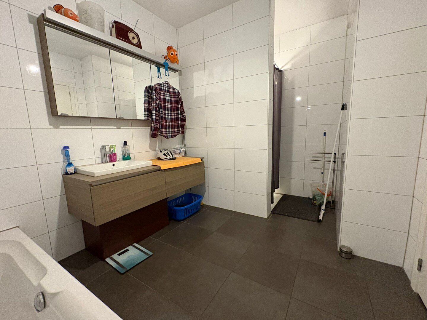 De nachthal biedt toegang tot de 2 slaapkamers en de badkamer. De badkamer is volledig betegeld en beschikt over een ruime inloopdouche, ligbad en een wastafel geïntegreerd in een meubel.