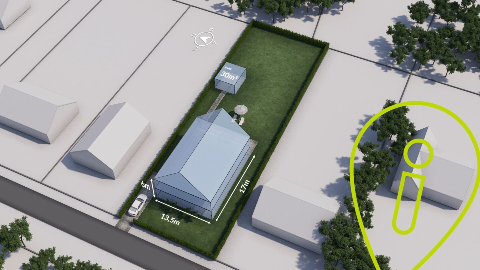 - gelijkvloers: max. 13,5 m breed op max. 17 m diep