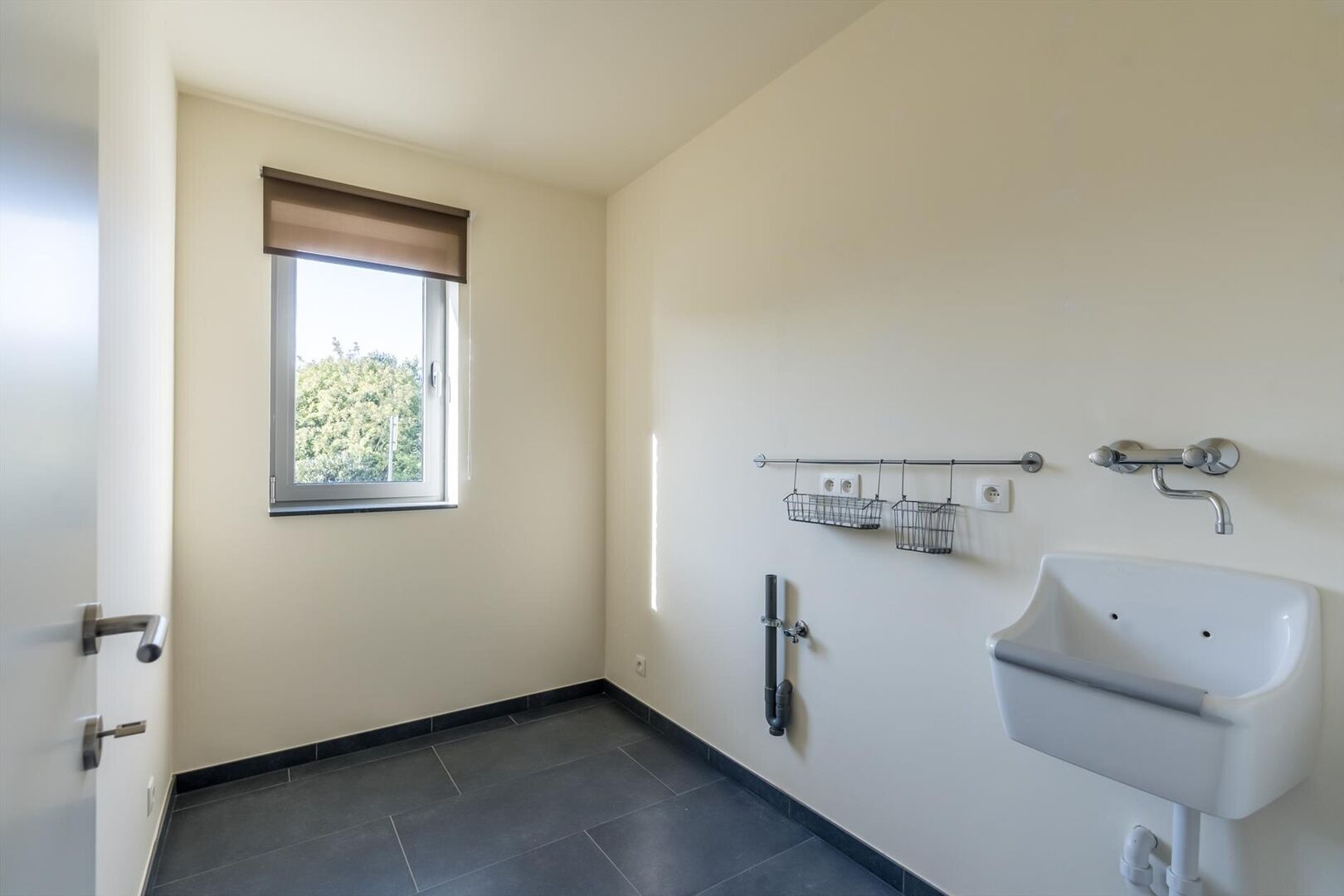 Op het gelijkvloers bestaat de woning uit een ruime en lichtrijke leefruimte, opgedeeld in een eethoek, zithoek en keuken met aansluitende berging. Verder is er een bureel / 4de slaapkamer, een wasplaats en een gastentoilet aanwezig op het gelijkvloers.