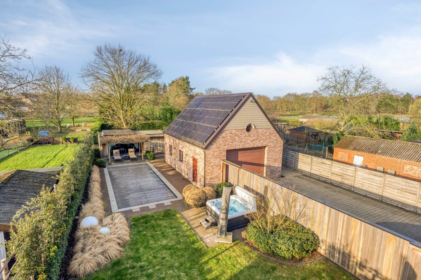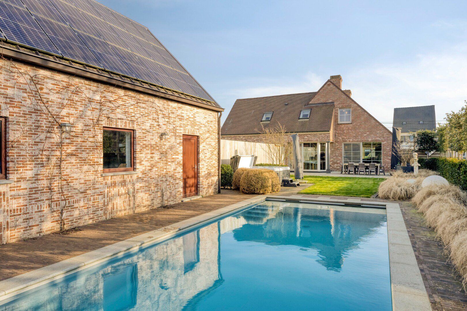 In de tuin geniet je tijdens de zomermaanden optimaal dankzij het ingebouwd zwembad met bijhorende poolhouse. Dit poolhouse is de ideale plaats om te genieten van de zon dankzij o.a. het zon georiënteerd terras. Binnenin is deze afgewerkt met een verwarmde zithoek, badkamertje (douche en toilet) en keukentje.