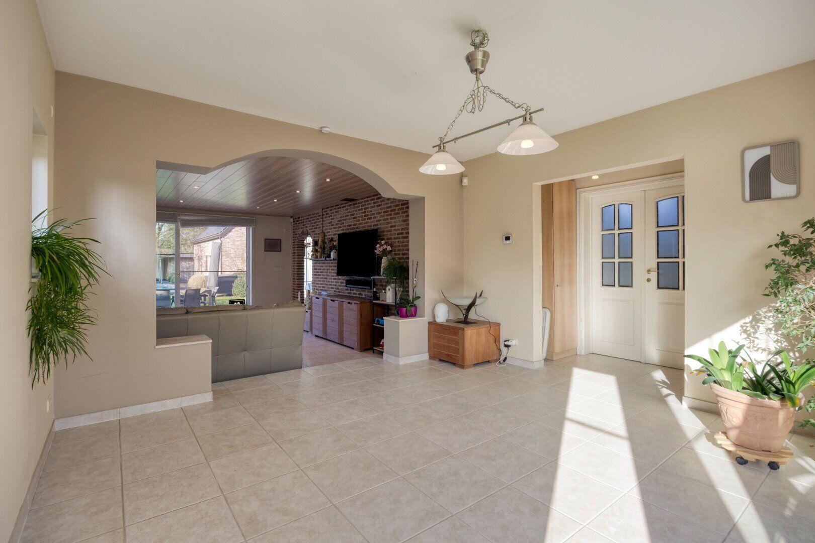 Achteraan de woning bevindt zich de achterinkomhal met doorgang naar de tuin, het gastentoilet en de ruime (verwarmde) garage.