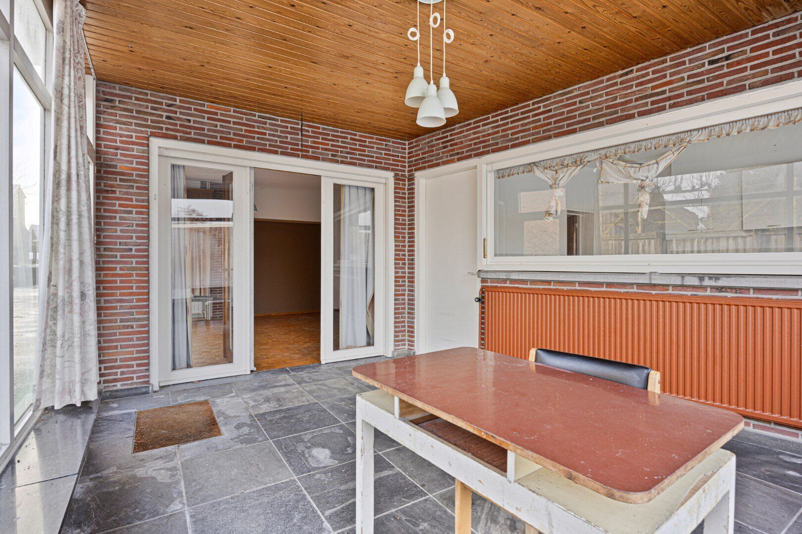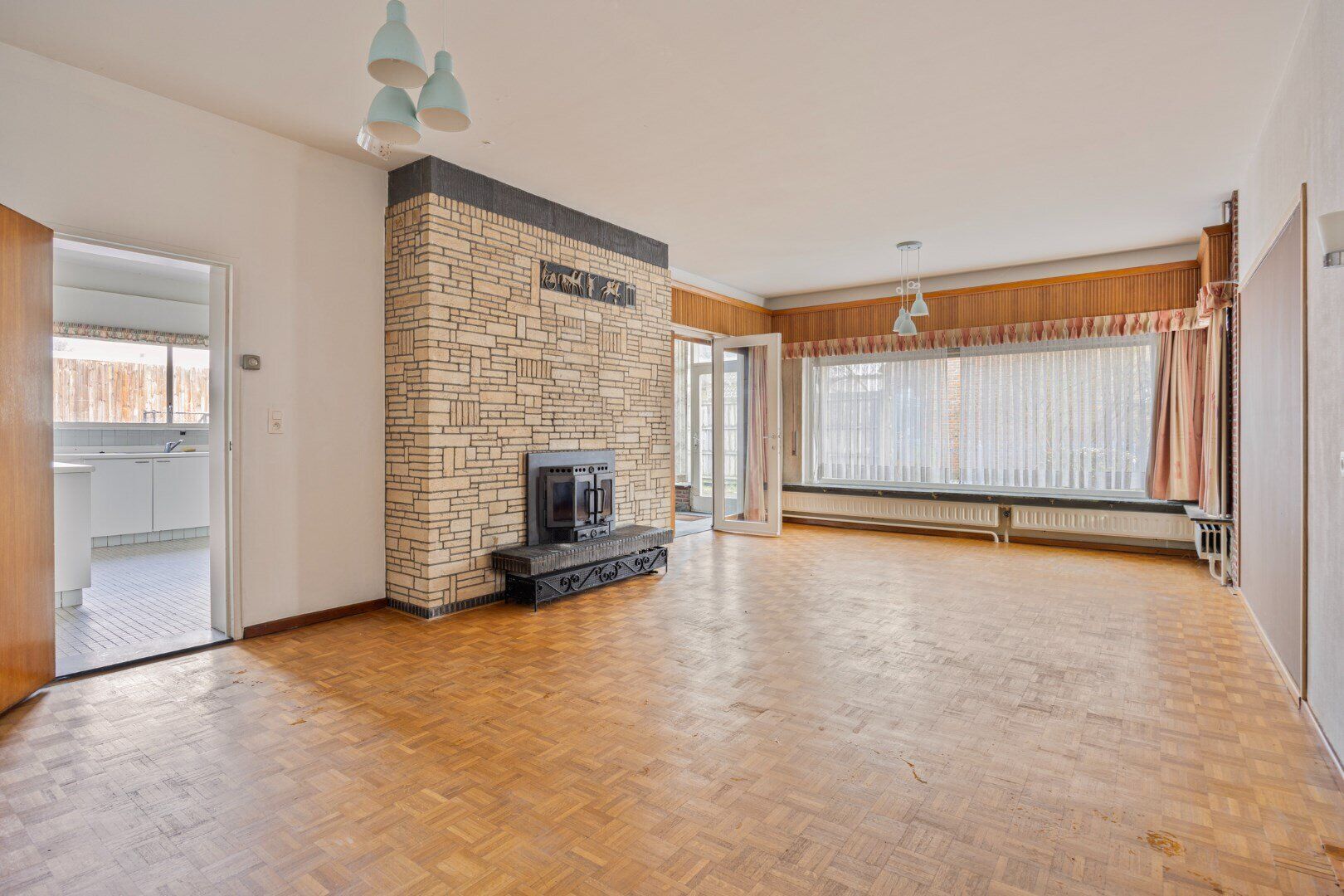 Je betreedt de woning via een ruime inkomhal die toegang geeft tot de woonkamer, gastentoilet en een slaapkamer. De grote woonkamer van 35 m² met open haard biedt veel mogelijkheden voor vrije inrichting van de ruimte. Achteraan de woning is er een veranda en de keuken, uitgerust met gasvuur, dampkap, dubbele spoelbak en voldoende kastruimte, en met zicht op de tuin.