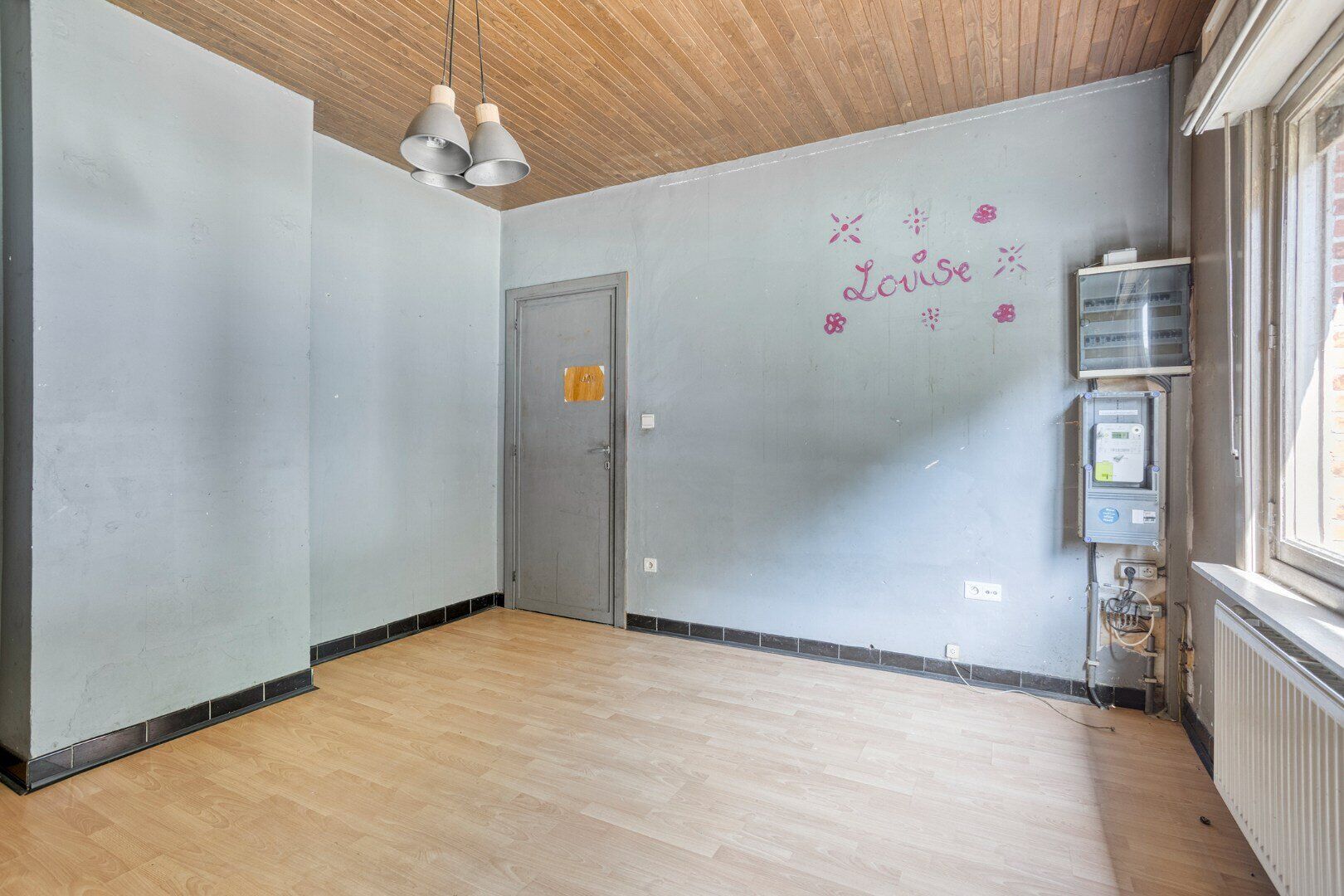 Op de eerste verdieping is er een ruime af te werken zolder, momenteel enkel bereikbaar via een raam langs de buitenkant van de woning.