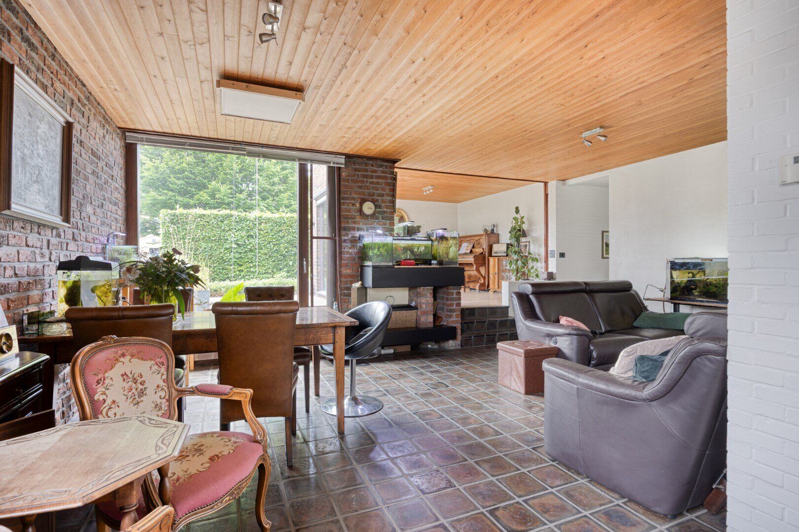 Via de inkomhal met gastentoilet en vestiaireruimte kom je in de ruime woonkamer welke opgedeeld is in een zithoek op parketvloer en een leefgedeelte.