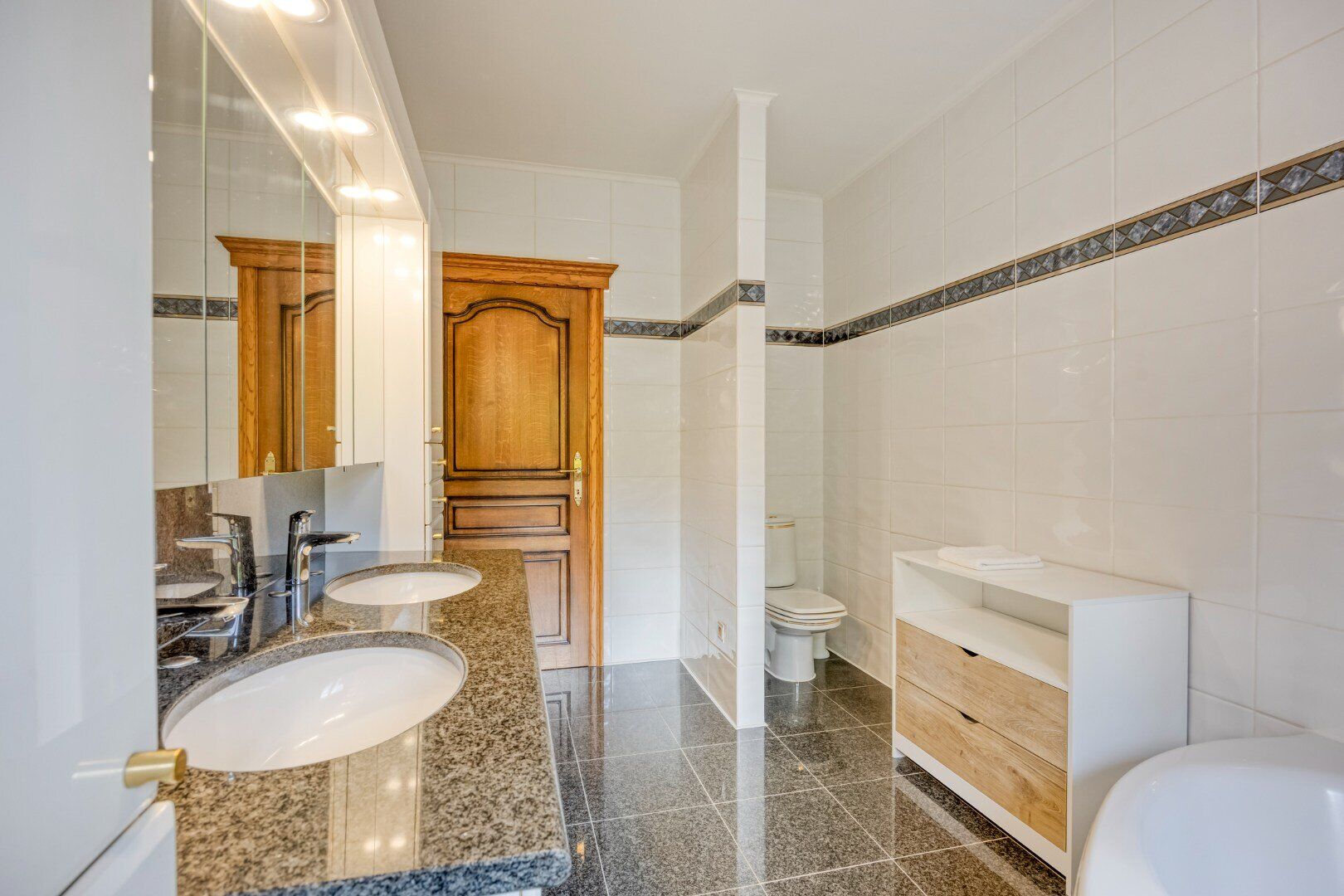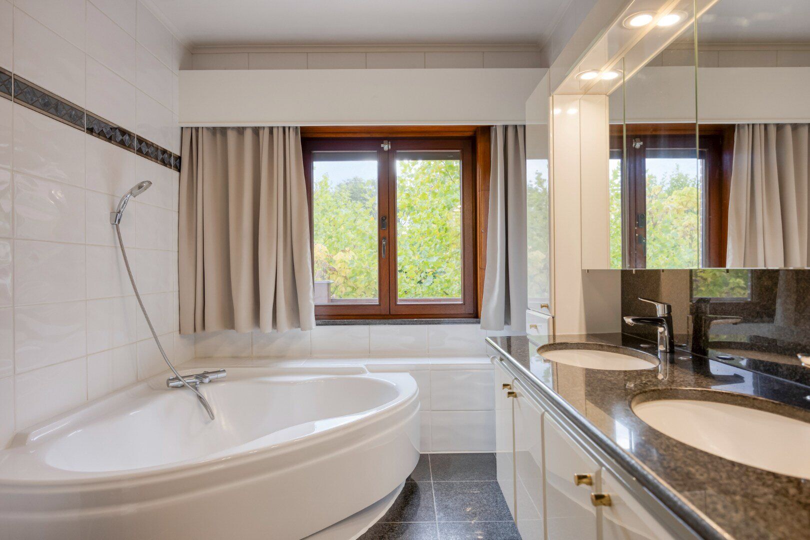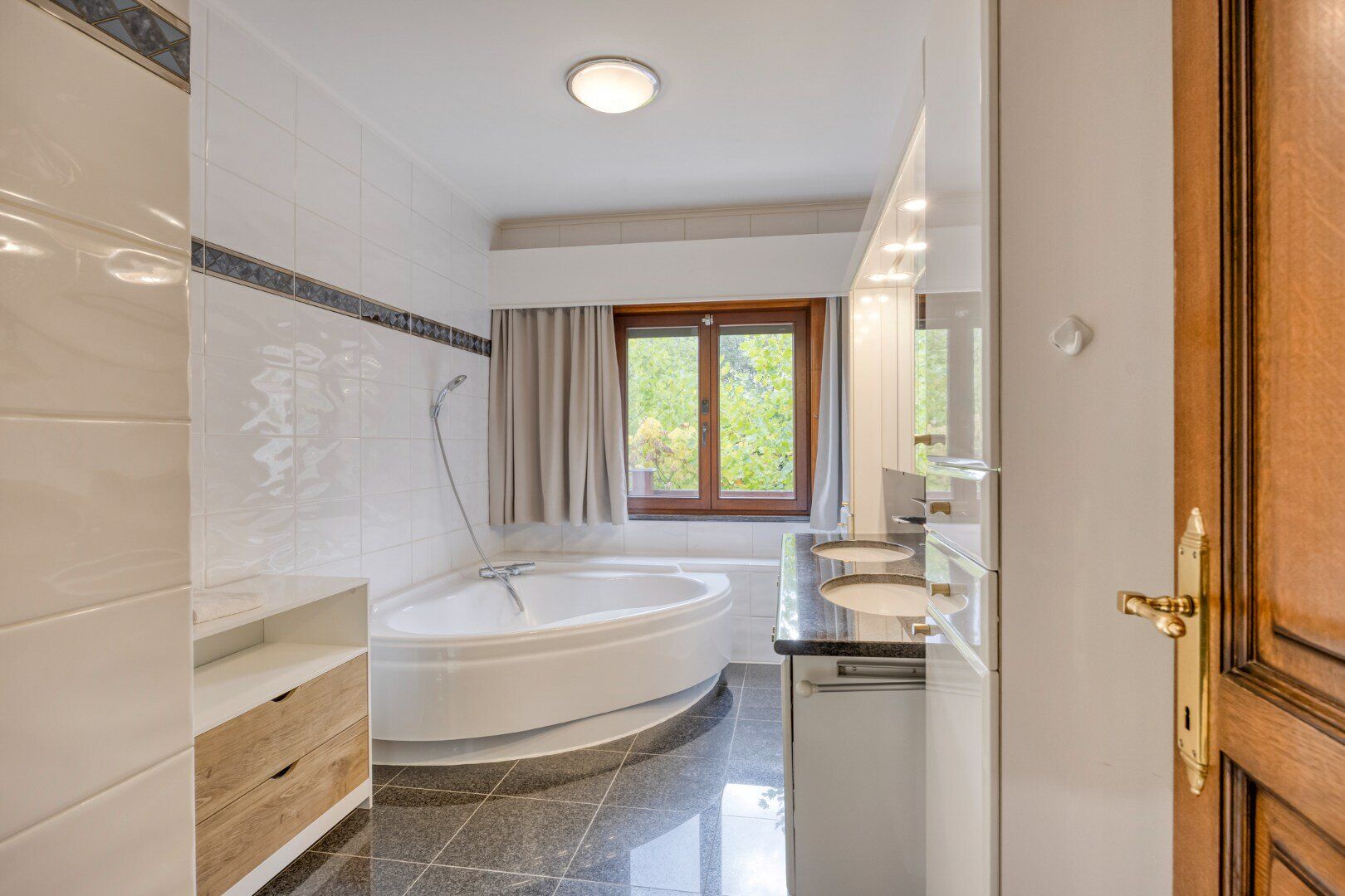De nachthal geeft uit op 3 ruime slaapkamers, een extra kamer, een badkamer en de garage. Deze badkamer is uitgerust met een ligbad, toilet en dubbele wastafel.