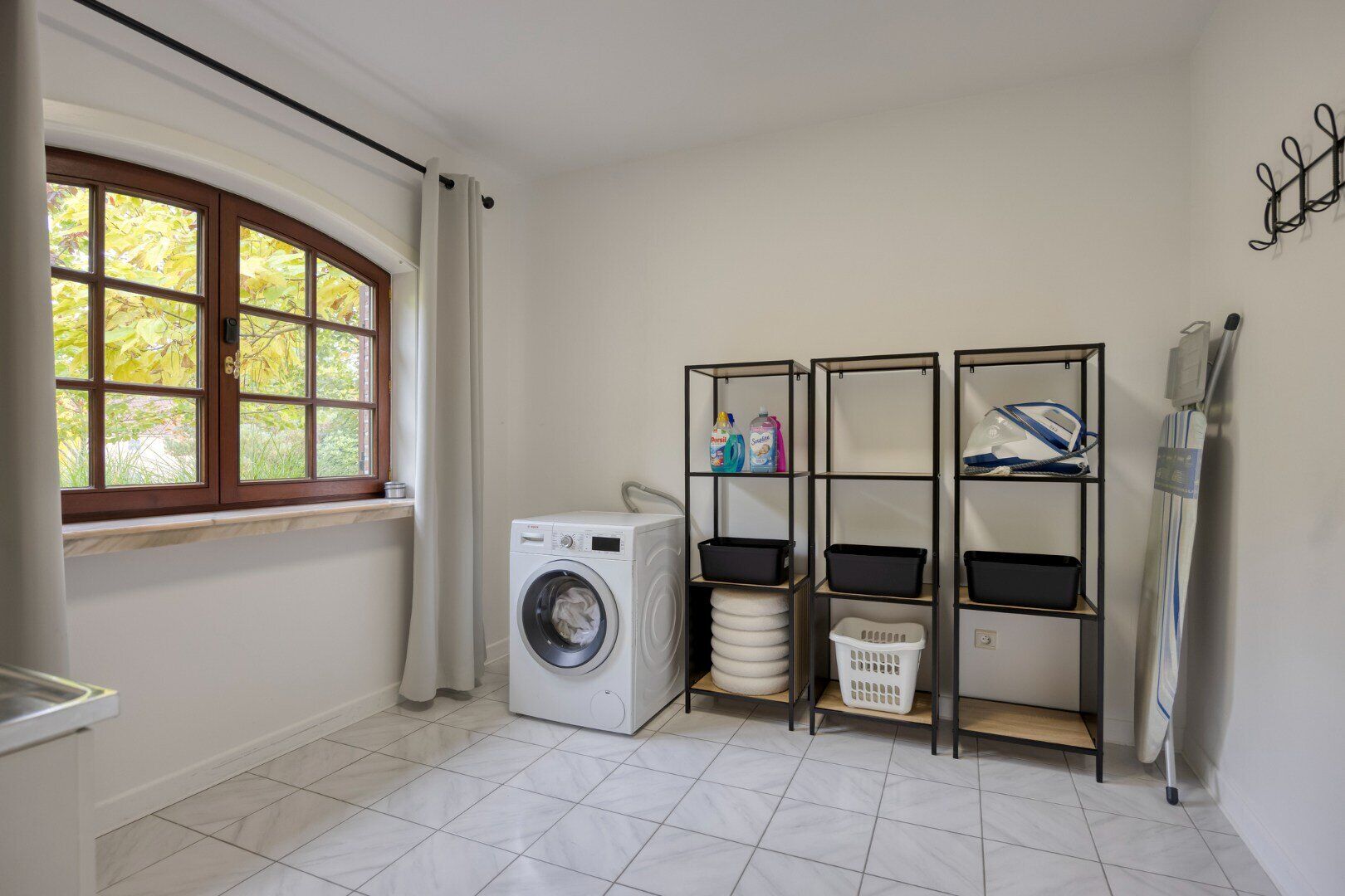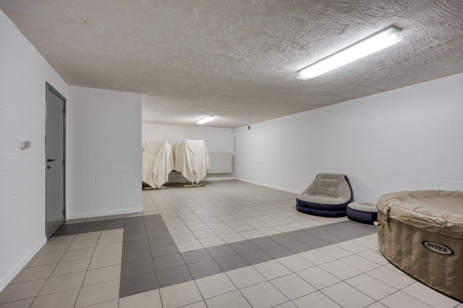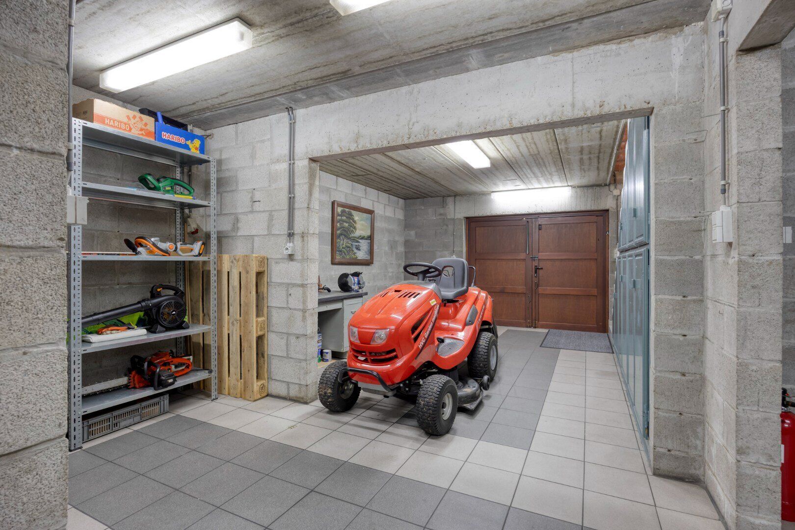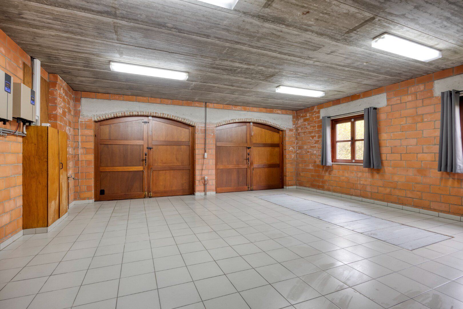 De garage op het gelijkvloers biedt ruimte voor twee auto's droog en warm te parkeren en een praktische ruimte achteraan.