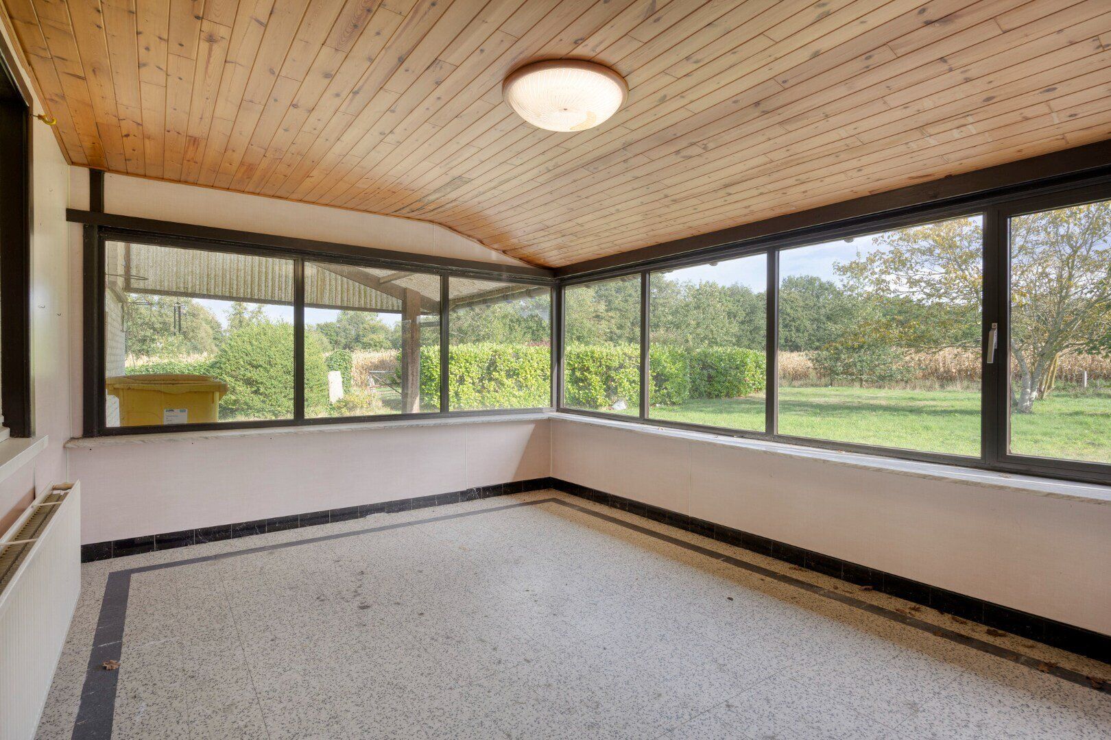 Binnenin bestaat de woning uit een lichtrijke leefruimte met eetkamer, die aansluit op een veranda. Vanuit de veranda bereik je de gesloten keuken, die gedeeltelijk geïnstalleerd is. Verder is er op het gelijkvloers een badkamer met enkele wastafel, zitbad en toilet, een bergruimte en een grote garage.