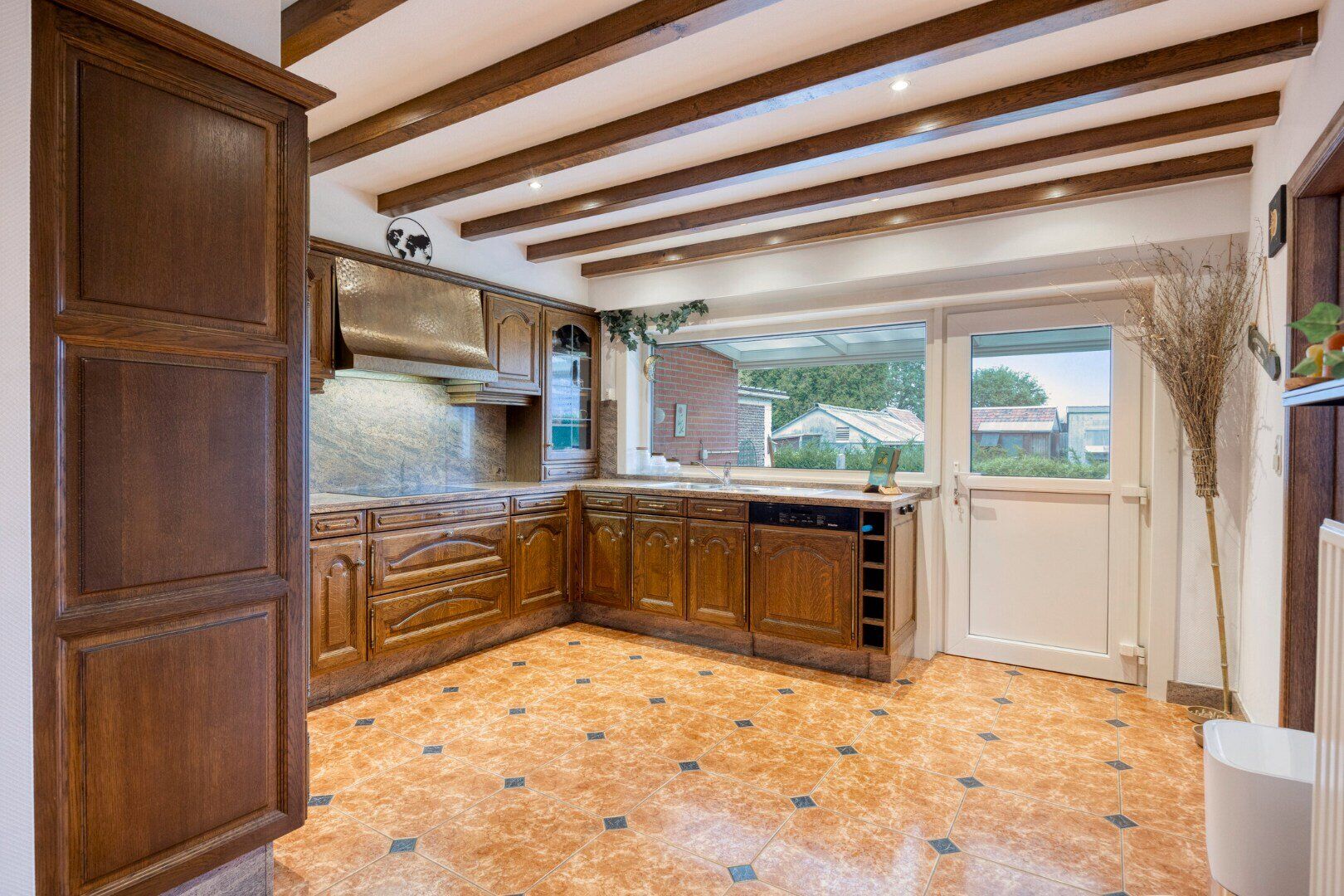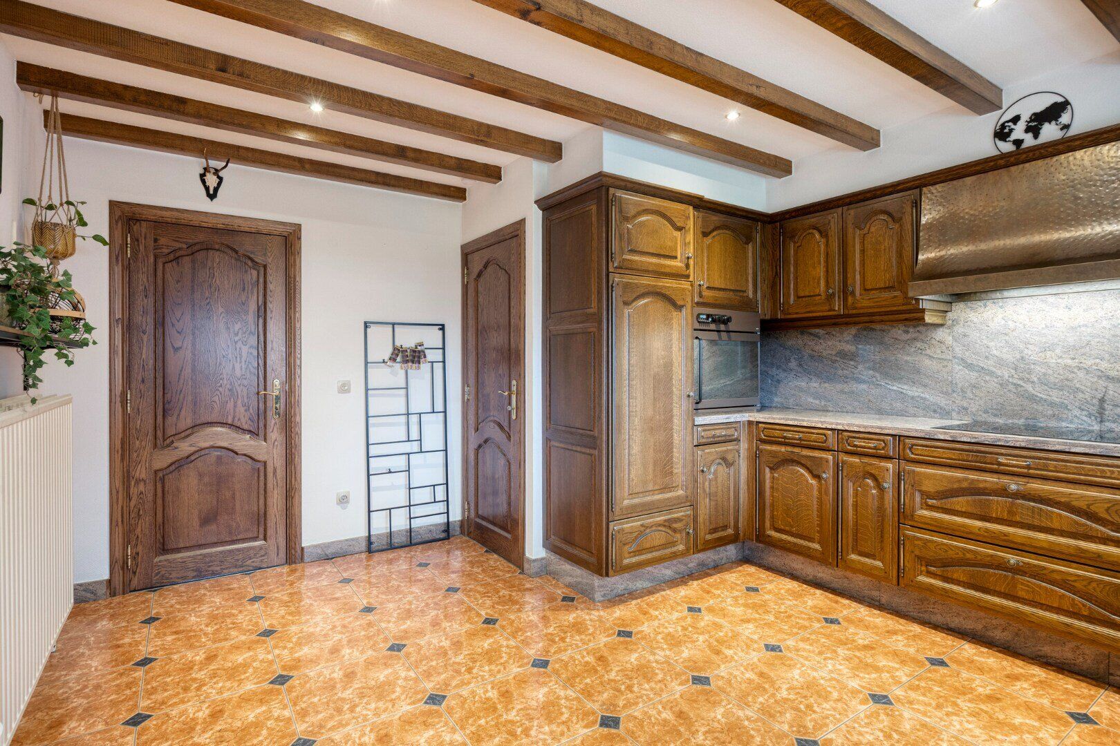 Aansluitend bevindt zich de praktische keuken, uitgerust met een heteluchtoven, elektrische kookplaat, afzuigkap, koelkast, vaatwasser, dubbele spoelbak en voldoende opbergruimte.