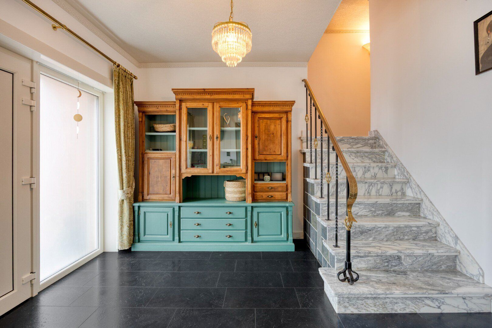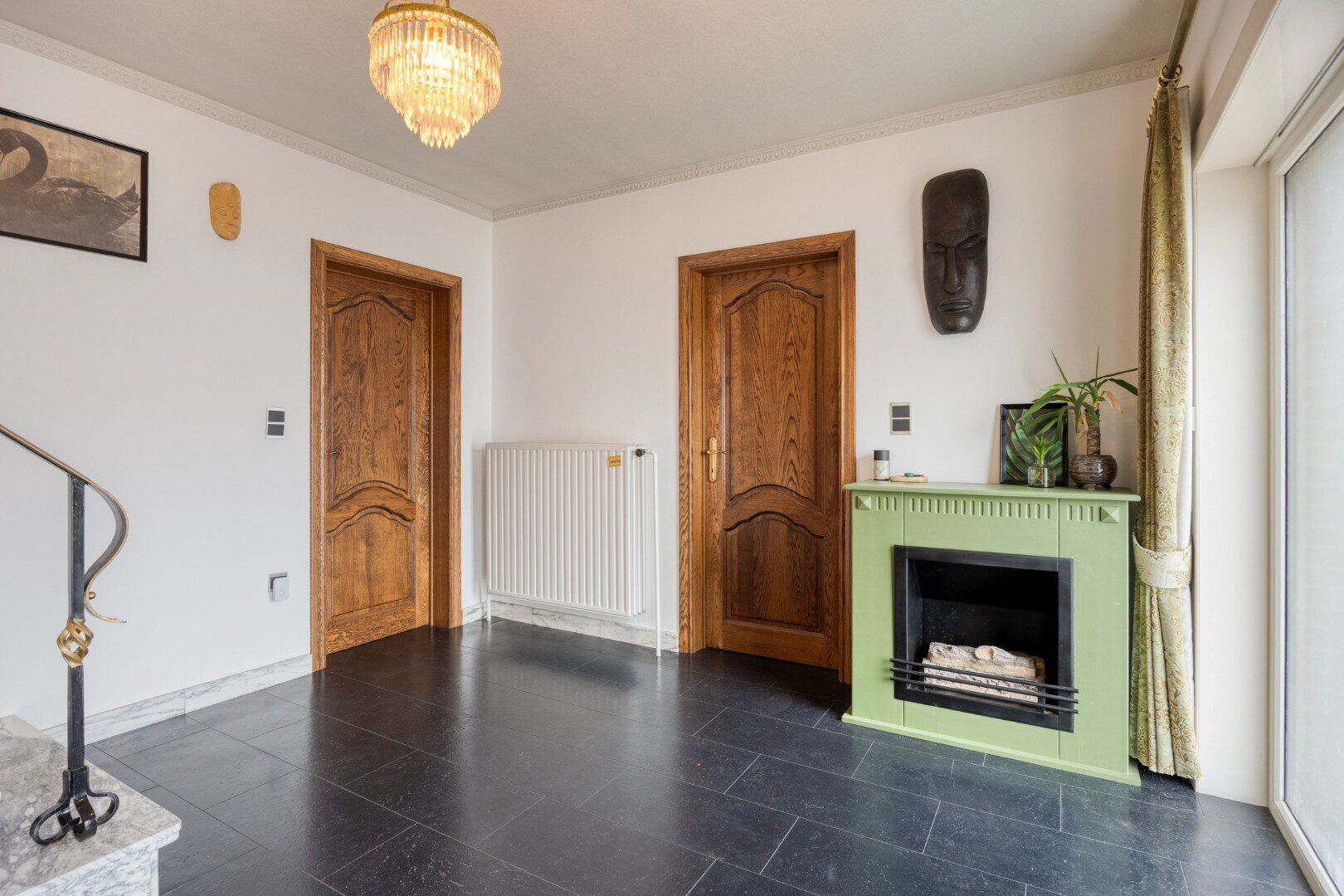 Via de ruime inkomhal met vestiaireruimte betreden we de lichtrijke leefruimte, ingedeeld in een gezellige zithoek en eetplaats. Dankzij de grote ramen geniet u hier van overvloedig natuurlijk licht. In de zithoek zorgt de haard voor extra sfeer en warmte.