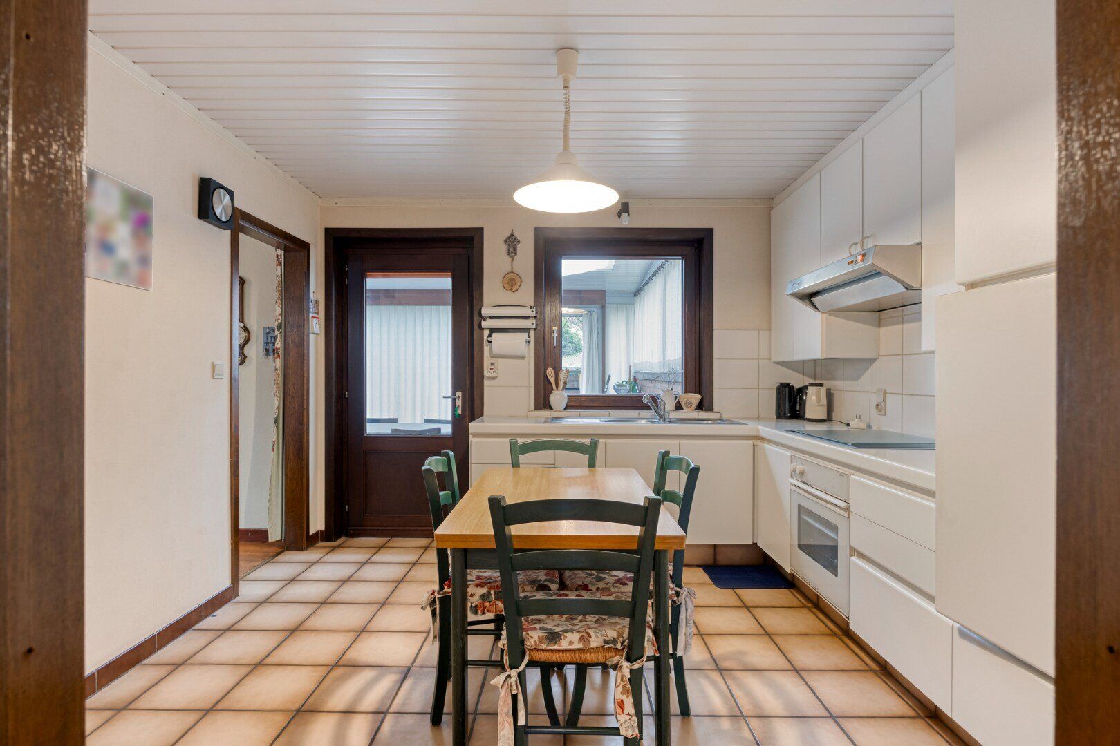We betreden de woning via de ruime inkomhal met gastentoilet. Vervolgens komen we in de leefruimte met toegang naar de keuken en veranda. Deze keuken is voorzien van voldoende kastruimte, een ijskast, elektrische kookplaat, afzuigkap en wastafel. In de veranda kan je heerlijk vertoeven en genieten van zicht over te tuin.