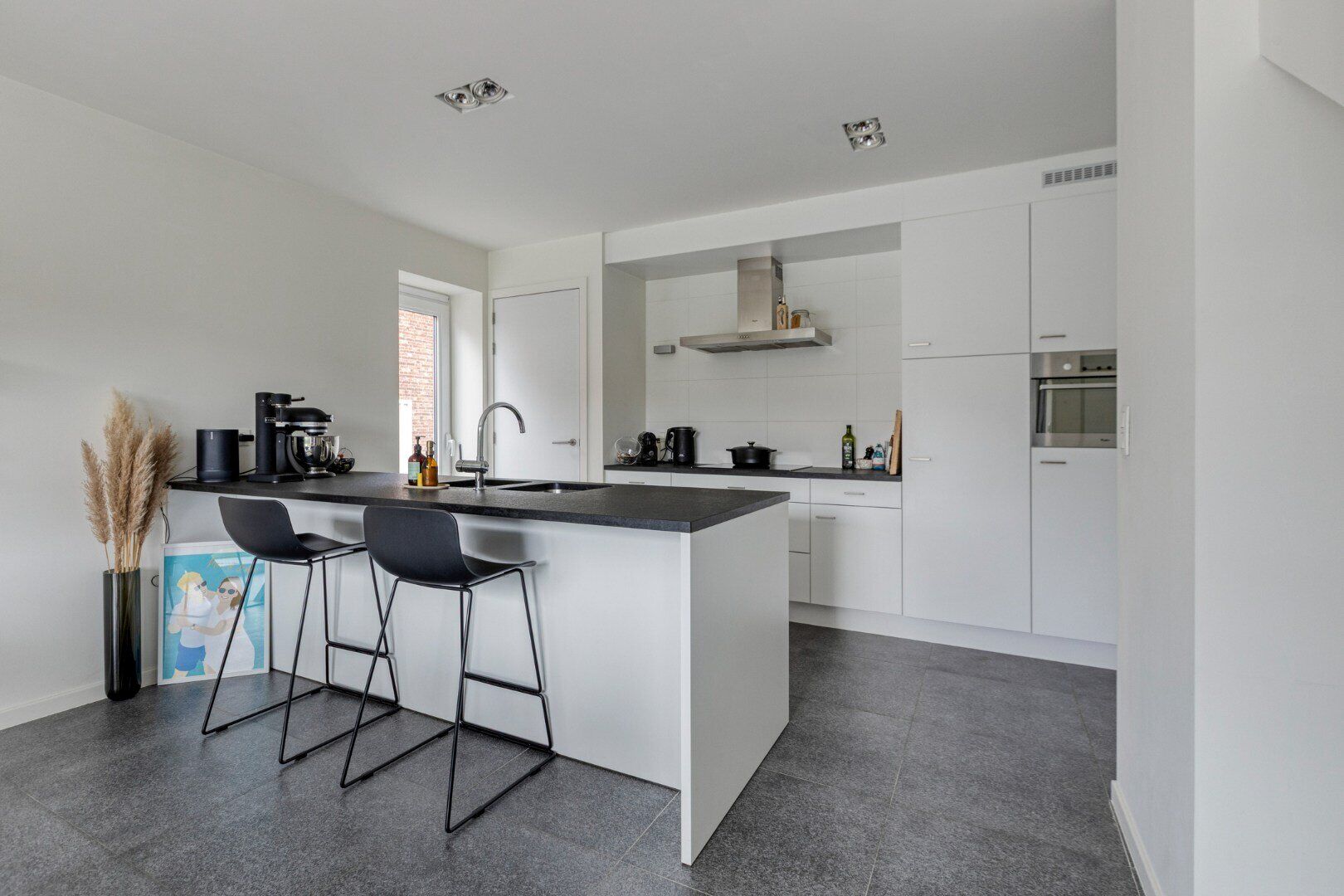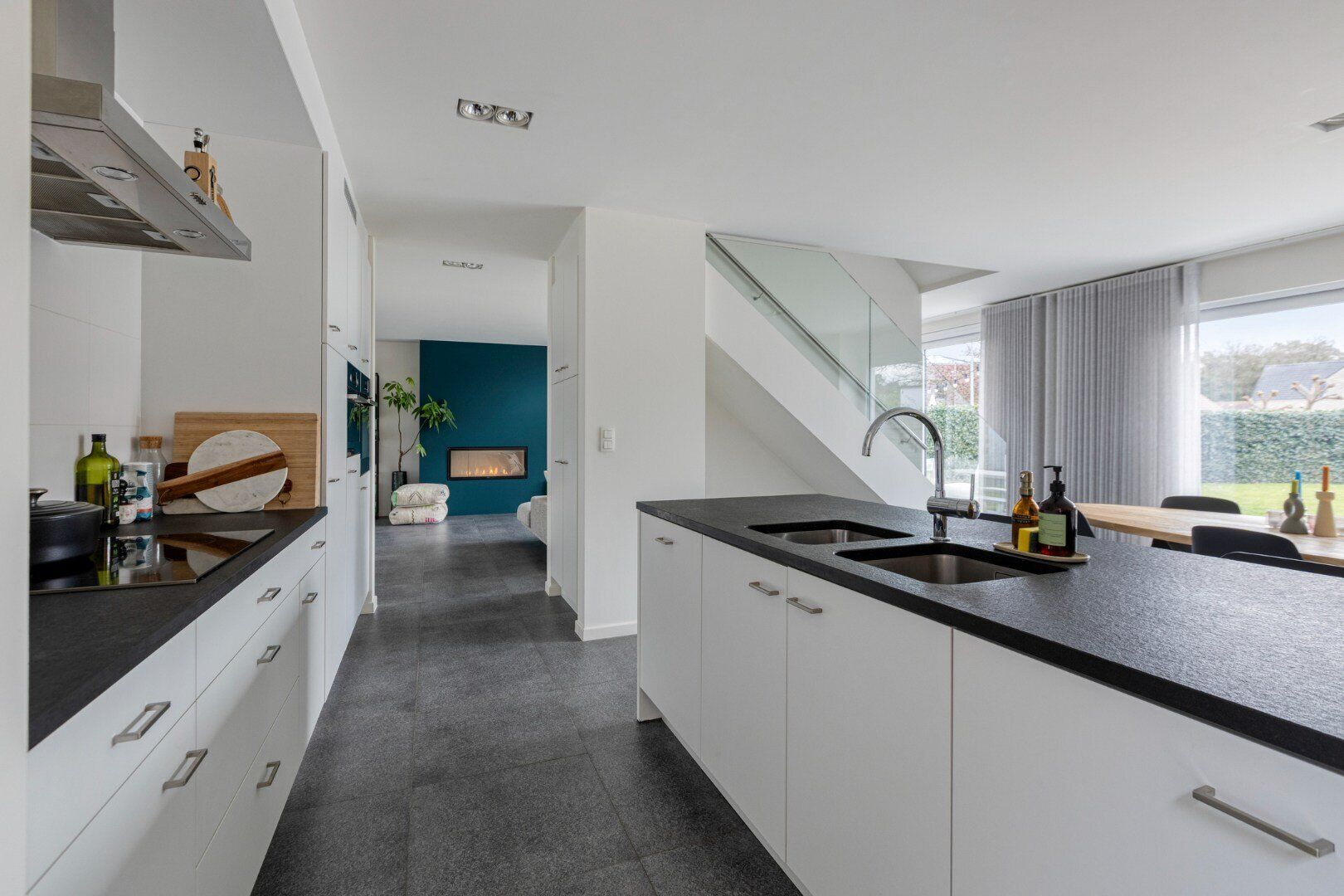 Via de inkomhal met vestiairekast en gastentoilet betreden we de open en lichtrijke leefruimte. Deze bestaat uit een ruime zithoek met gezellige gashaard, een bureauruimte, een eetkamer en een volledig ingerichte keuken. De keuken beschikt over een oven, microgolfoven, koelkast, diepvriezer, vaatwasser, inductiekookplaat, afzuigkap, spoelbak en ruime opbergmogelijkheden. Vanuit de leefruimte geniet u van een prachtig uitzicht op de tuin. Aansluitend aan de keuken bevindt zich een praktische berging met inbouwkasten, douchecabine en aansluiting voor wasmachine.