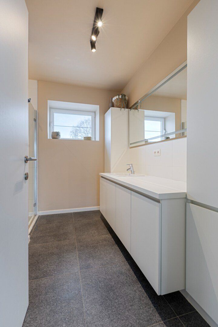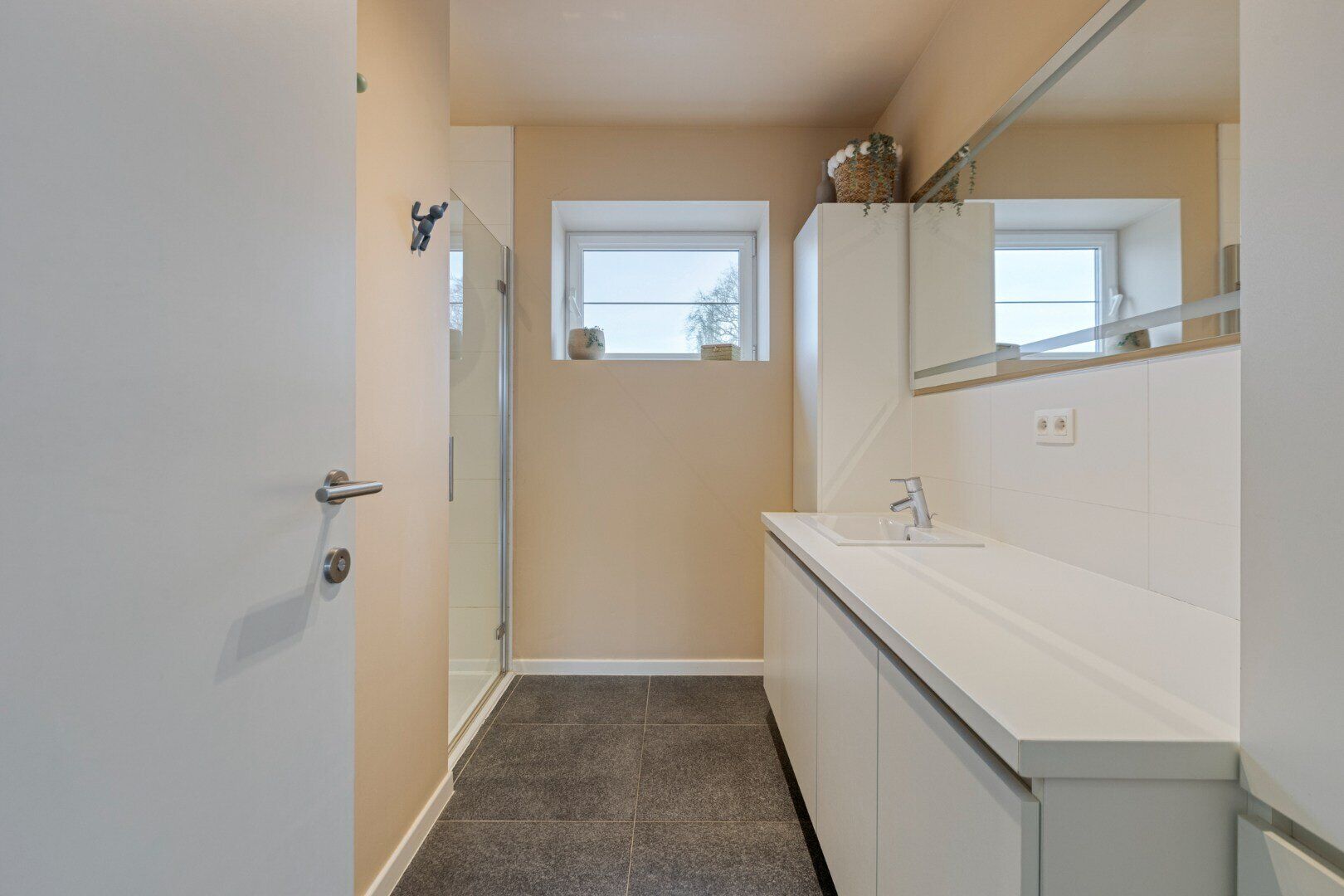 Op de eerste verdieping leidt de ruime en lichtrijke nachthal naar twee comfortabele slaapkamers, een stijlvolle badkamer en een apart toilet. De master bedroom biedt ruim voldoende plaats voor een volwaardige dressing. De badkamer is uitgerust met een inloopdouche en een wastafelmeubel met opbergruimte.