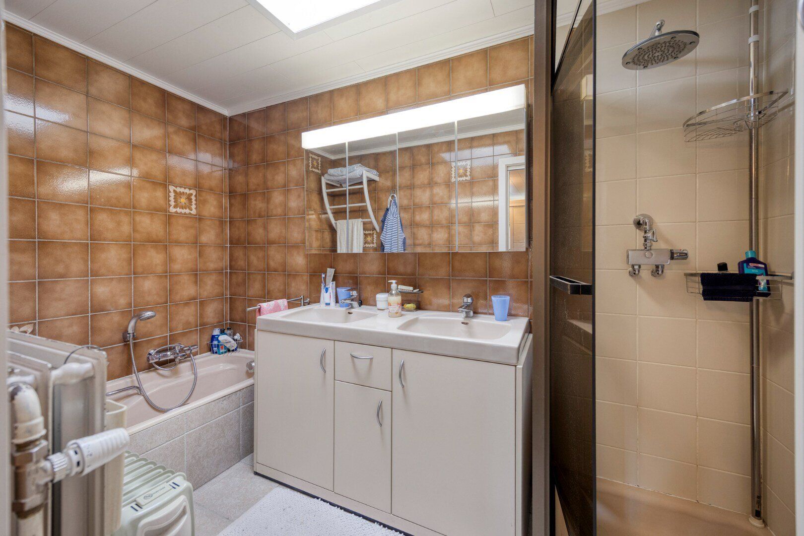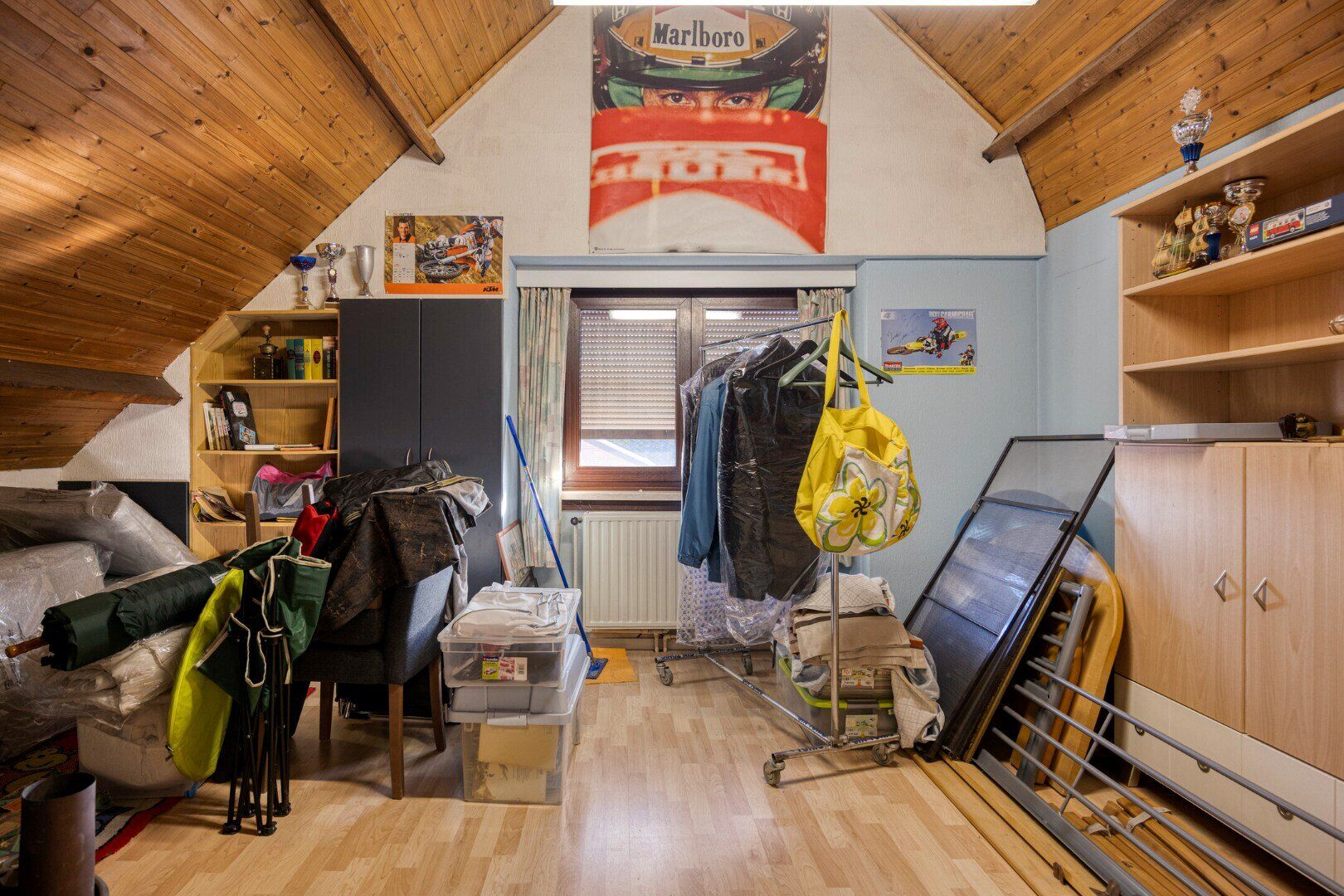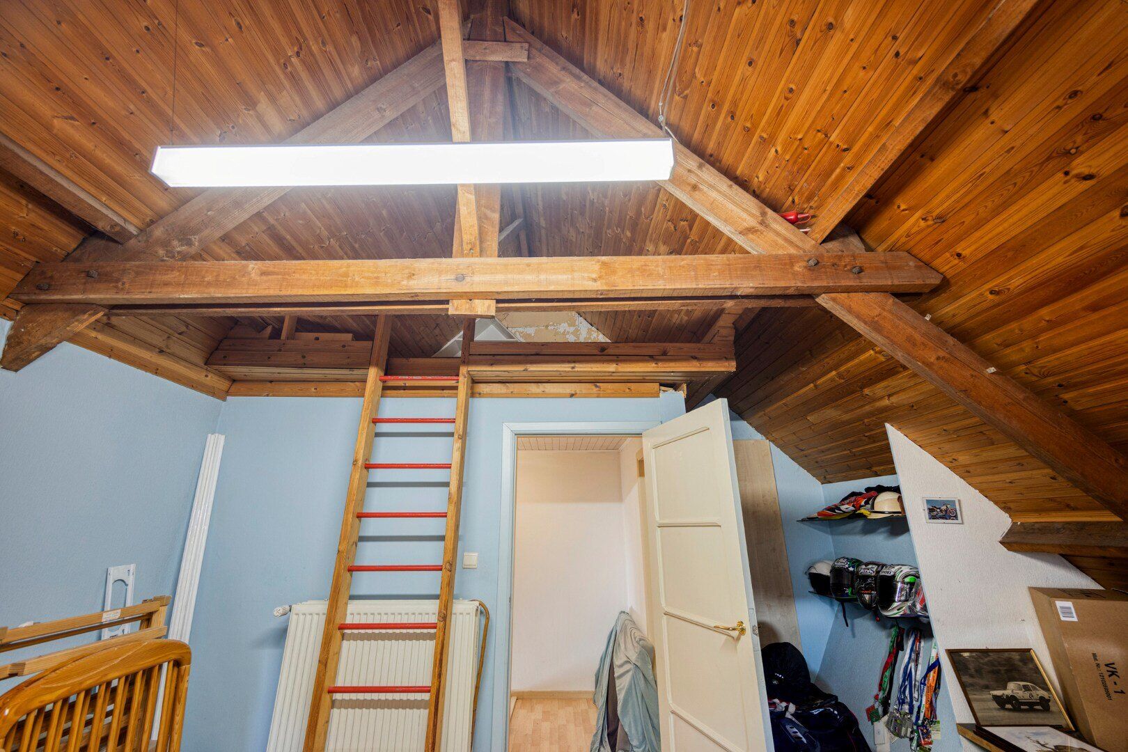 De verdieping deed vroeger dienst als kangoeroewoning en is bijgevolg zeer ruim ingedeeld. Zo zijn er vier slaapkamers, waarvan één ingericht als dressing met inbouwkasten, een volledig betegelde badkamer met ligbad, douchecel en dubbele wastafel in meubel, een apart toilet en een wasplaats met inbouwkasten en uitgietbak. Achteraan bevindt zich nog een deels te renoveren (de dakplaten werden in 2025 vernieuwd) veranda die aansluit op het dakterras. Gezien de royale oppervlakte biedt deze verdieping bijzonder veel mogelijkheden. Een vaste trap geeft uit op de deels ingerichte zolderverdieping met mezzanine en deels bergruimte. Het dak werd in 2016 voorzien van nieuwe pannen en harde isolatieplaten.