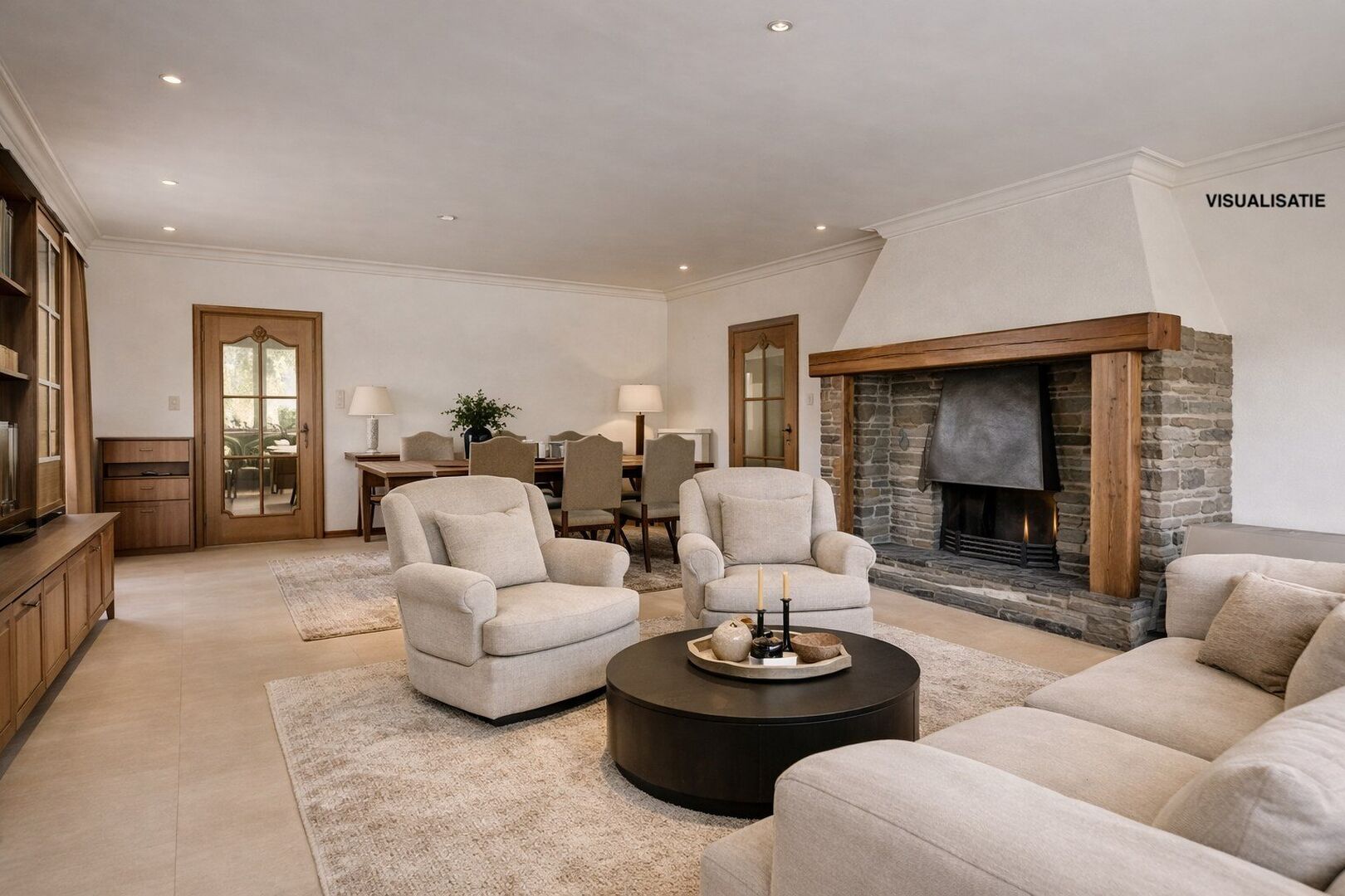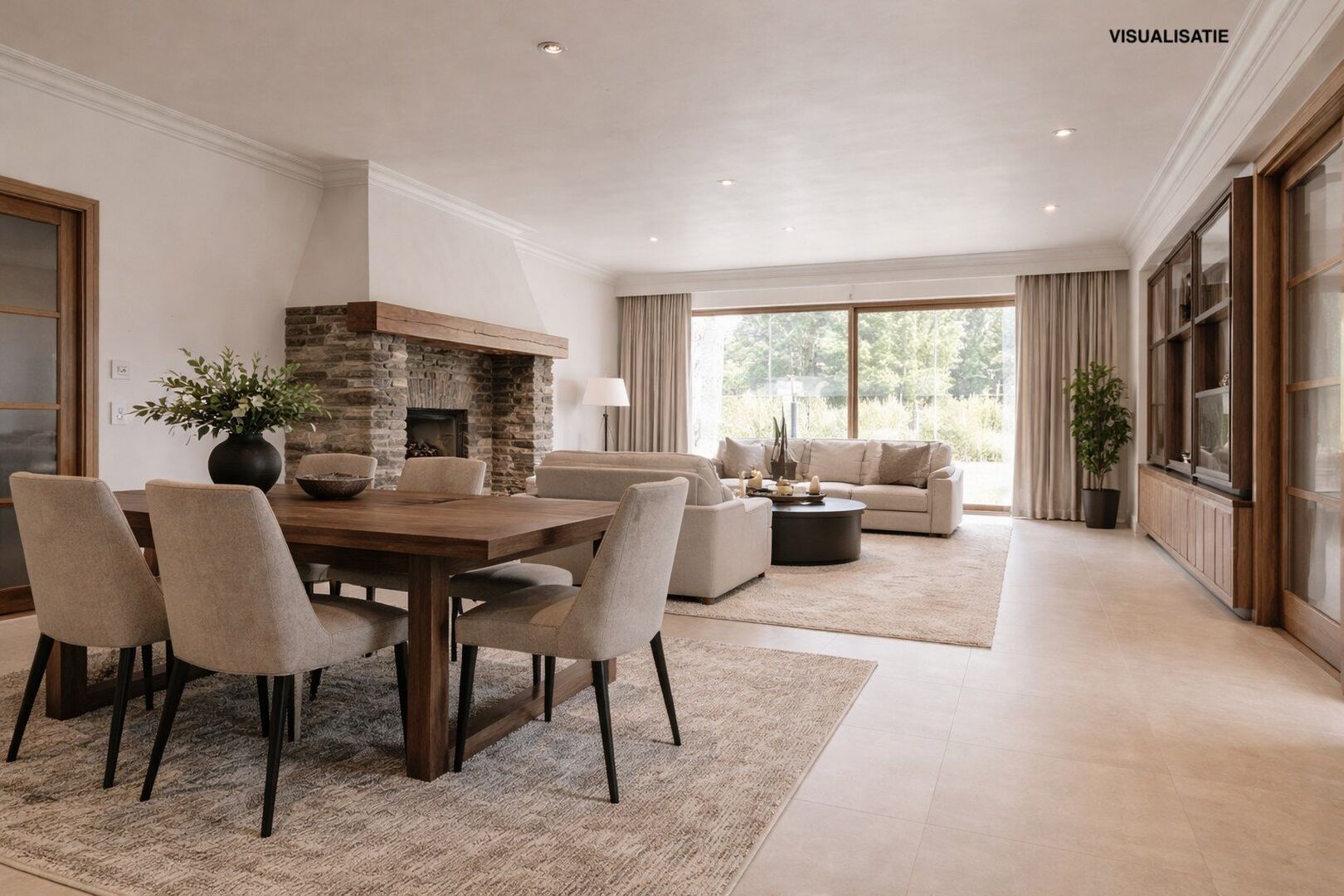 Via de riante inkomhal met vestiaire en gastentoilet betreedt u de lichtrijke woonkamer, die is ingedeeld in een gezellige zithoek en een ruime eethoek. De sfeervolle houthaard vormt het warme hart van de woonkamer. Dankzij het grote schuifraam staat de leefruimte in directe verbinding met de tuin, waardoor u optimaal geniet van licht en ruimte.