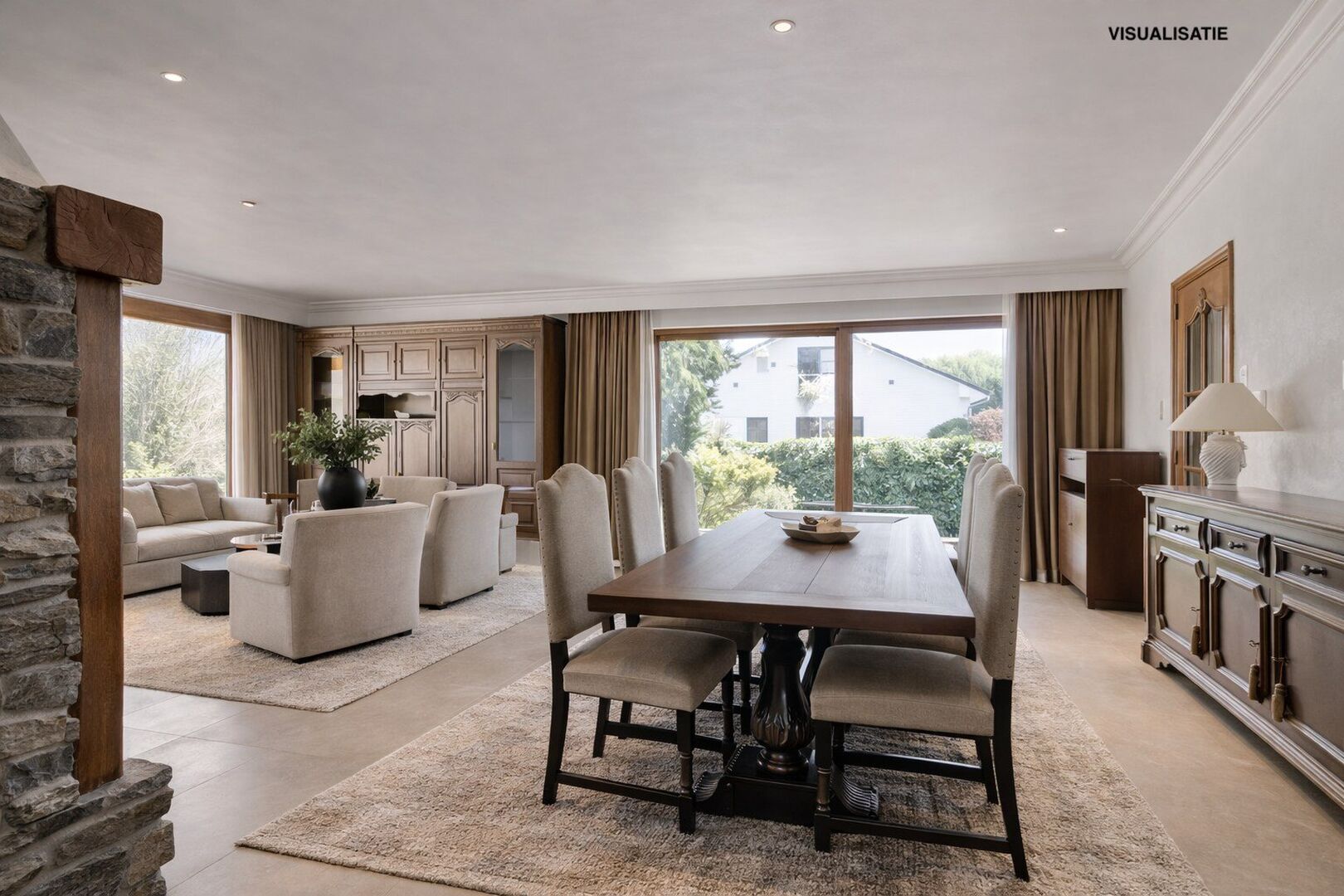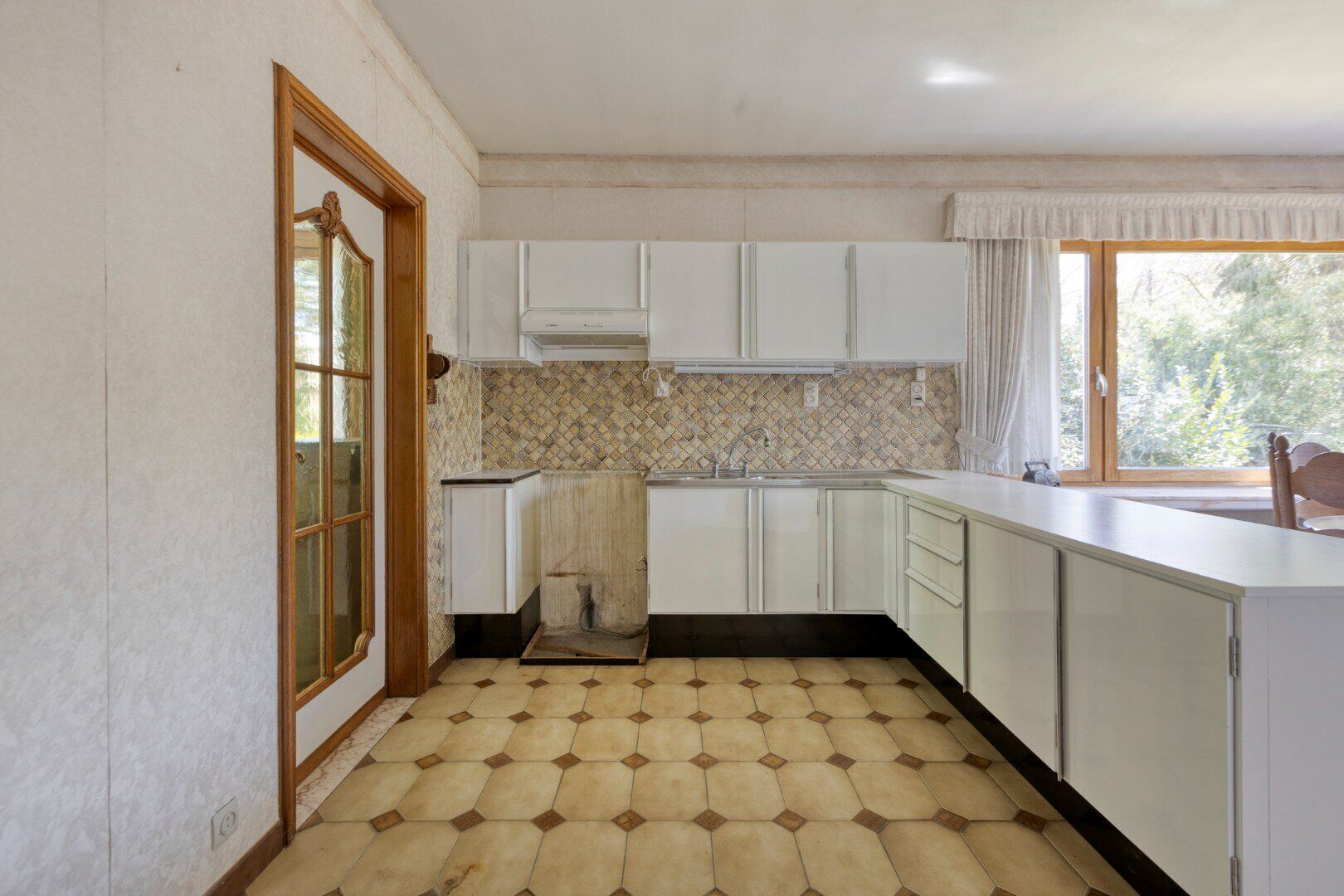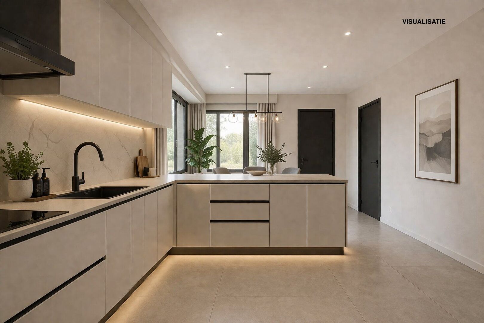 Aansluitend bevindt zich de ruime keuken, die eveneens veel natuurlijke lichtinval heeft en een aangename connectie met de tuin biedt.