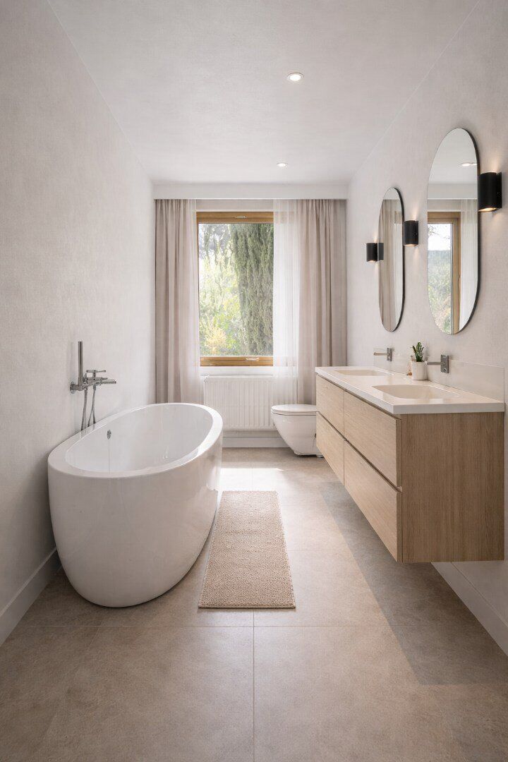 De nachthal leidt naar vier volwaardige slaapkamers en de badkamer, die uitgerust is met een ligbad, dubbele wastafel en toilet.