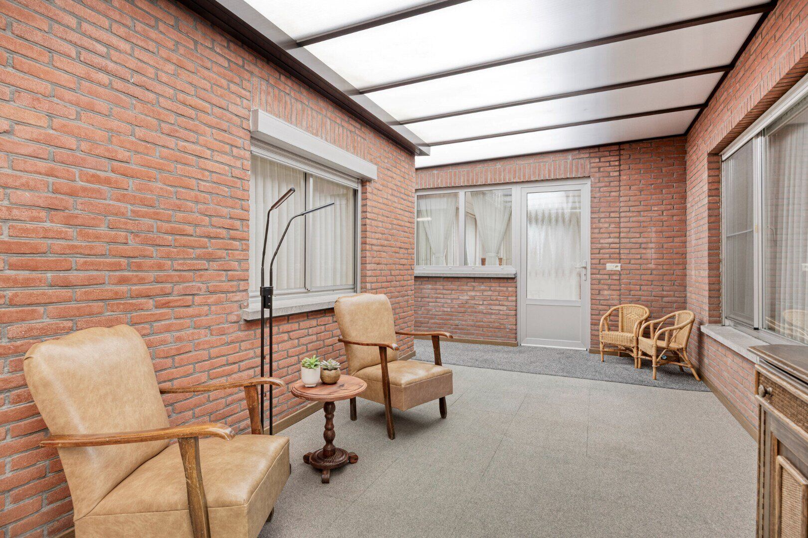 Via de inkomhal, met vestiaireruimte, kom je in de ruim ingedeelde leefruimte die bestaat uit een zithoek en een eethoek. Dankzij de grote ramen geniet je van aangenaam veel lichtinval. De gashaard zorgt dan weer voor extra gezelligheid in de winterperiode. De leefkeuken is voorzien van een koelkast, keramische kookplaat, afzuigkap, dubbele spoeltafel, voldoende kastruimte en een ontbijt-/eethoek. In de aansluitende verwarmde tuinkamer is het een groot deel van het jaar zalig genieten. Ook hier zorgen de vele ramen en de lichtkoepel voor veel licht.