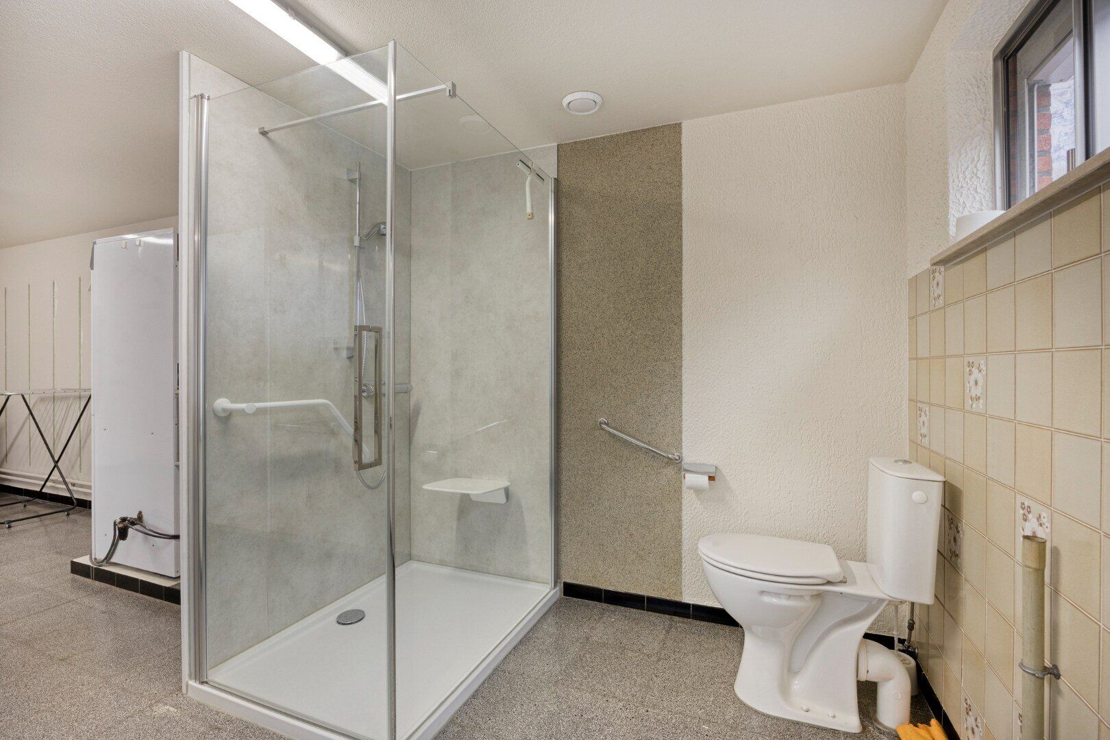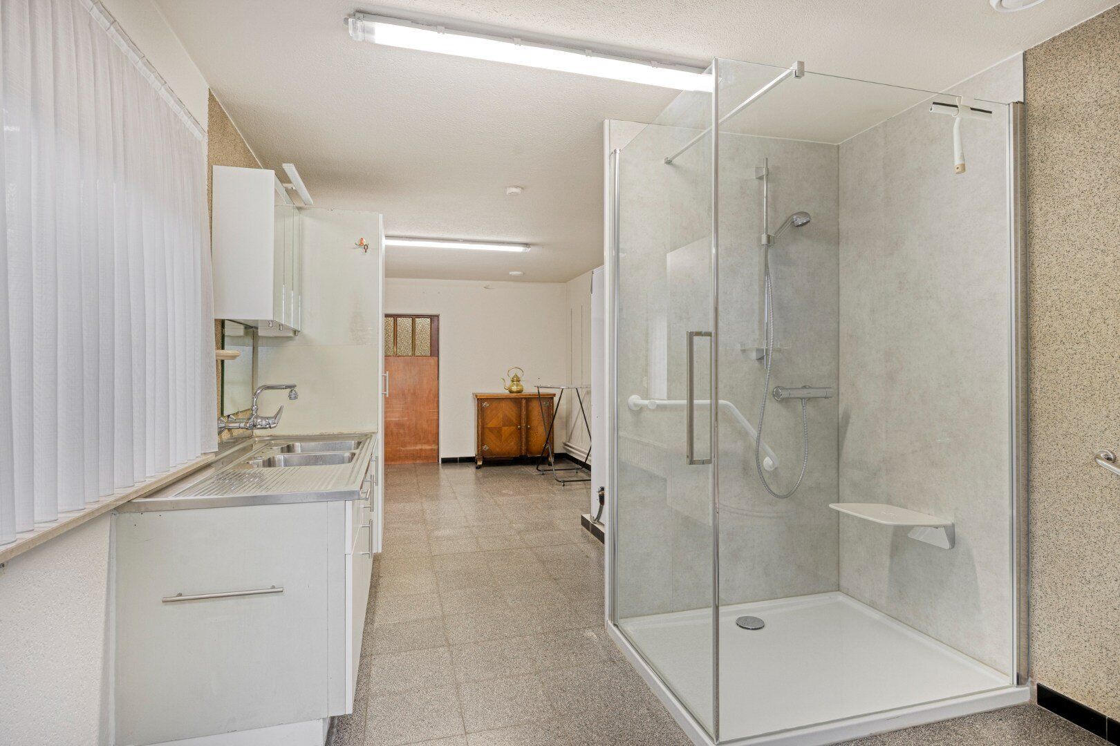 De dubbele garage met extra stockageruimte is een handige troef, en bijvoorbeeld ook interessant voor een zelfstandige die extra ruimte nodig heeft.