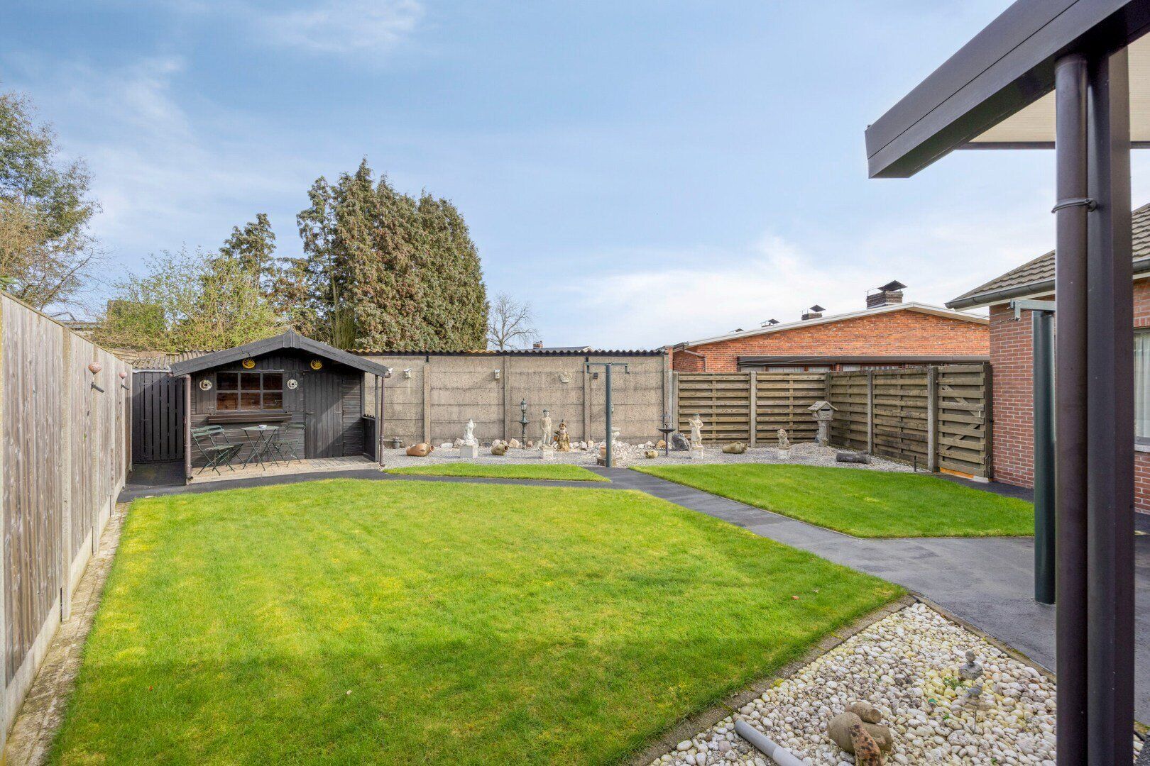 De tuin is volledig omheind, biedt voldoende privacy en beschikt over een overdekt terras, een automatische sproei-installatie en een houten tuinhuis dat ideaal is voor de stockage van tuinmateriaal.