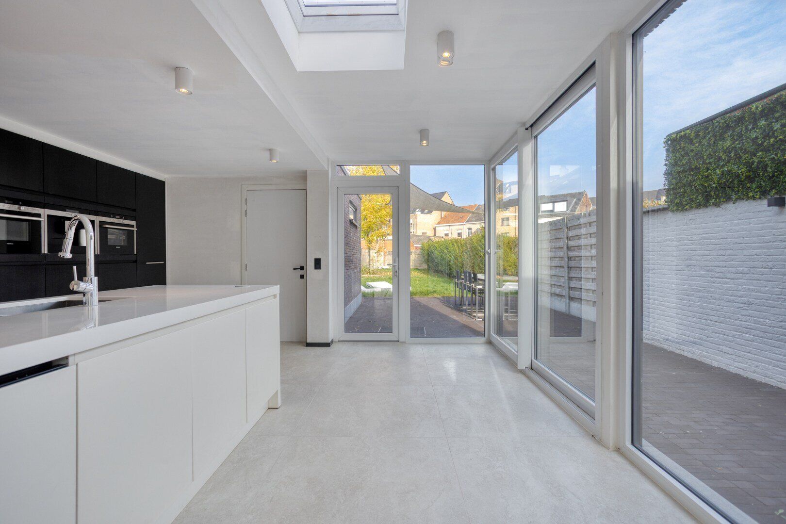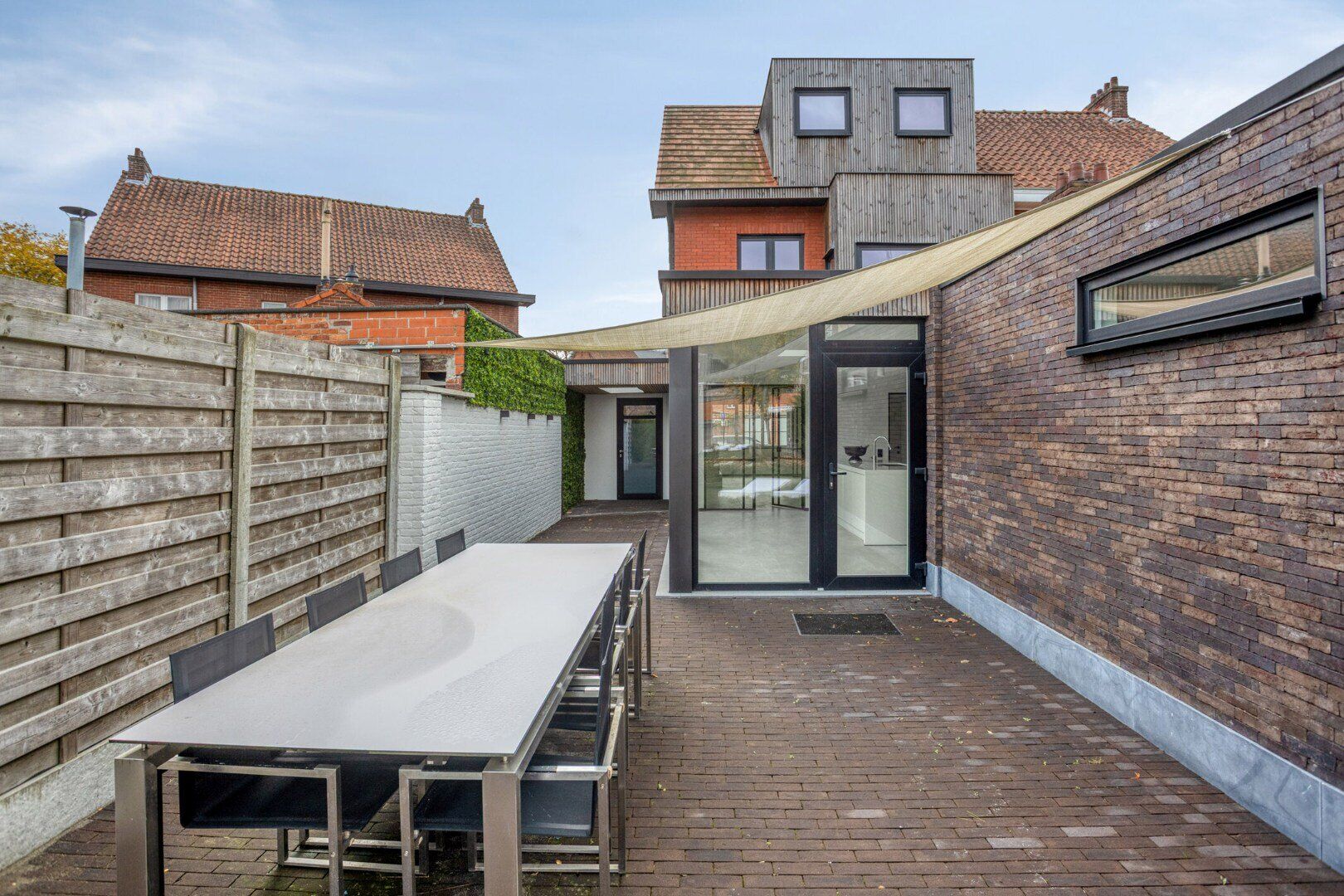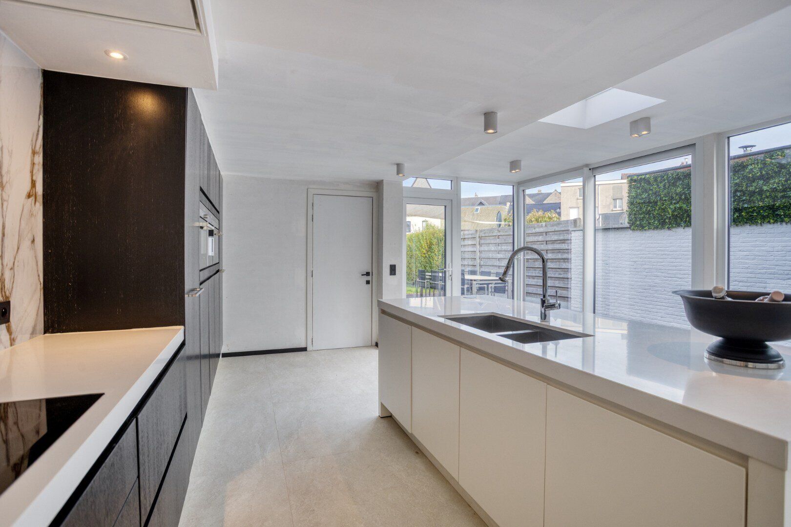 Via de inkomhal kom je in de ruime, lichtrijke leefruimte die naadloos aansluit op de open keuken. De keuken is volledig uitgerust met Siemens-toestellen (grote koelkast, aparte diepvries, wijnkoeler en ingebouwd koffiemachine) en werd stijlvol afgewerkt met oog voor kwaliteit. Twee elegante stalen en glazen deuren verbinden keuken en leefruimte. Achter de keuken bevinden zich een gastentoilet en een praktische berging met toegang tot de zonnige tuin en het terras. Achteraan de tuin is nog een tweede terras voorzien, ideaal om te genieten van de avondzon. De woning beschikt bovendien over een droge kelder met extra bergruimte.