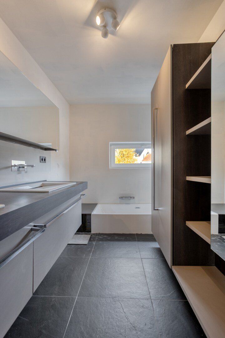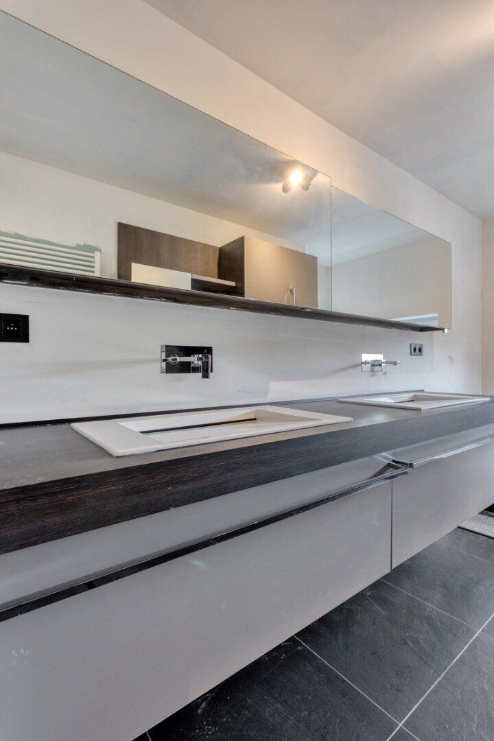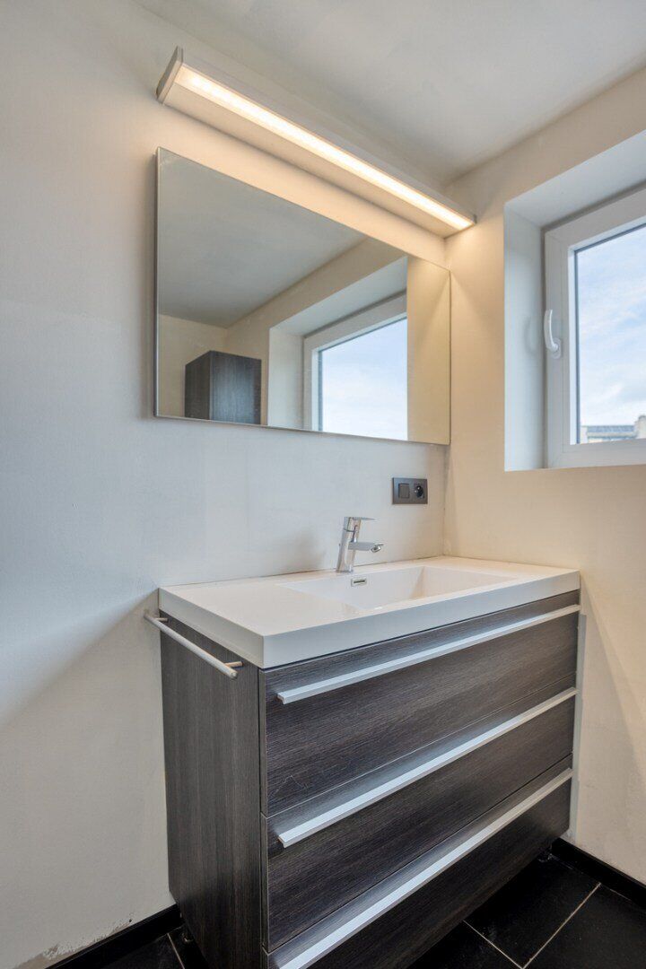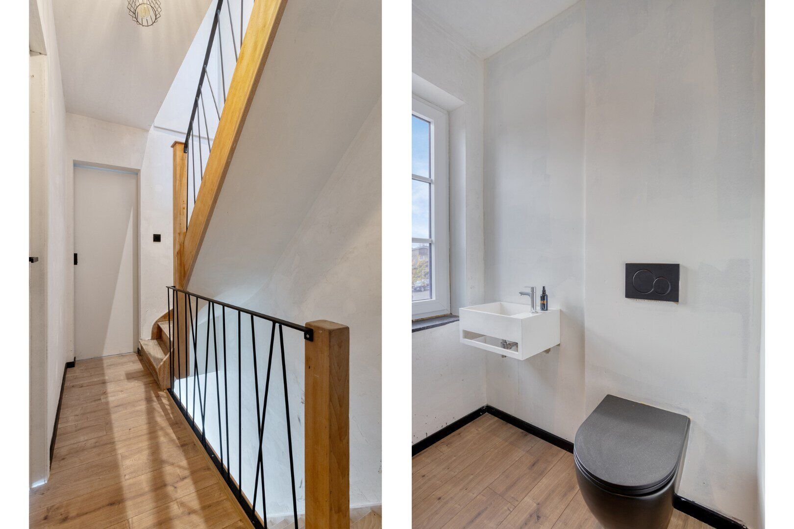 De eerste verdieping biedt twee ruime slaapkamers, een apart nachttoilet en een volledig uitgeruste badkamer met bad, dubbele wastafel en veel kastruimte.