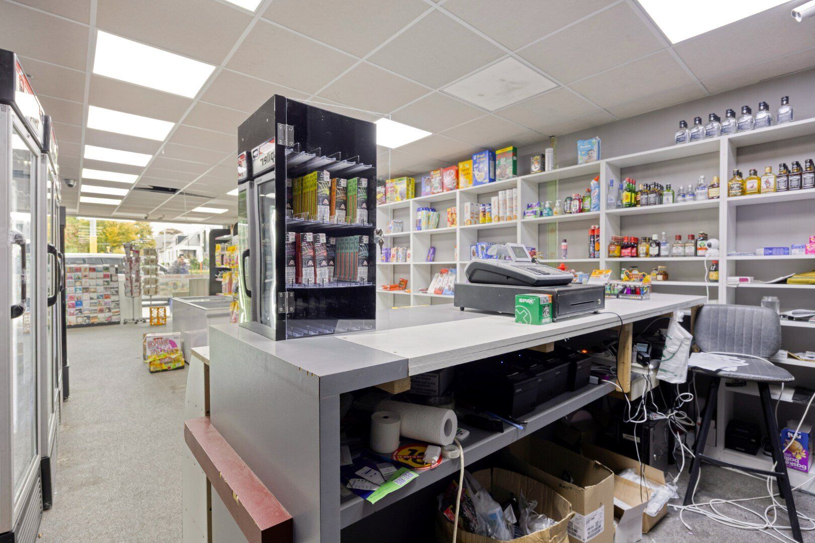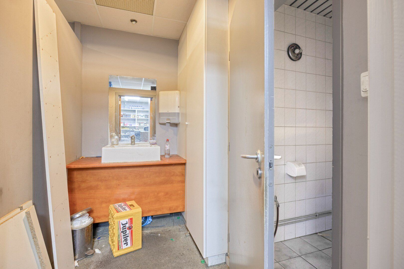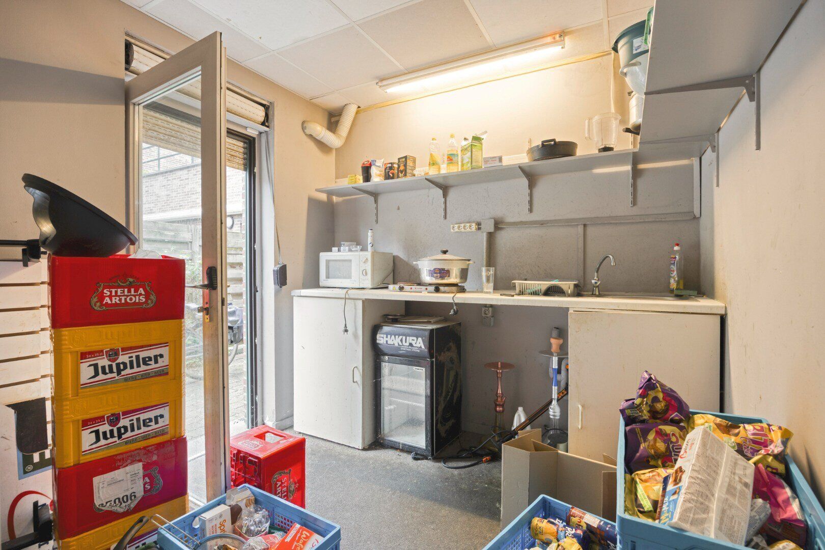 Achteraan bevinden zich een primitieve badkamer en keuken. Dankzij de achterdeur kan je ook de eigendom ook langs achter bereiken, ideaal als je niet door de zaak wil.